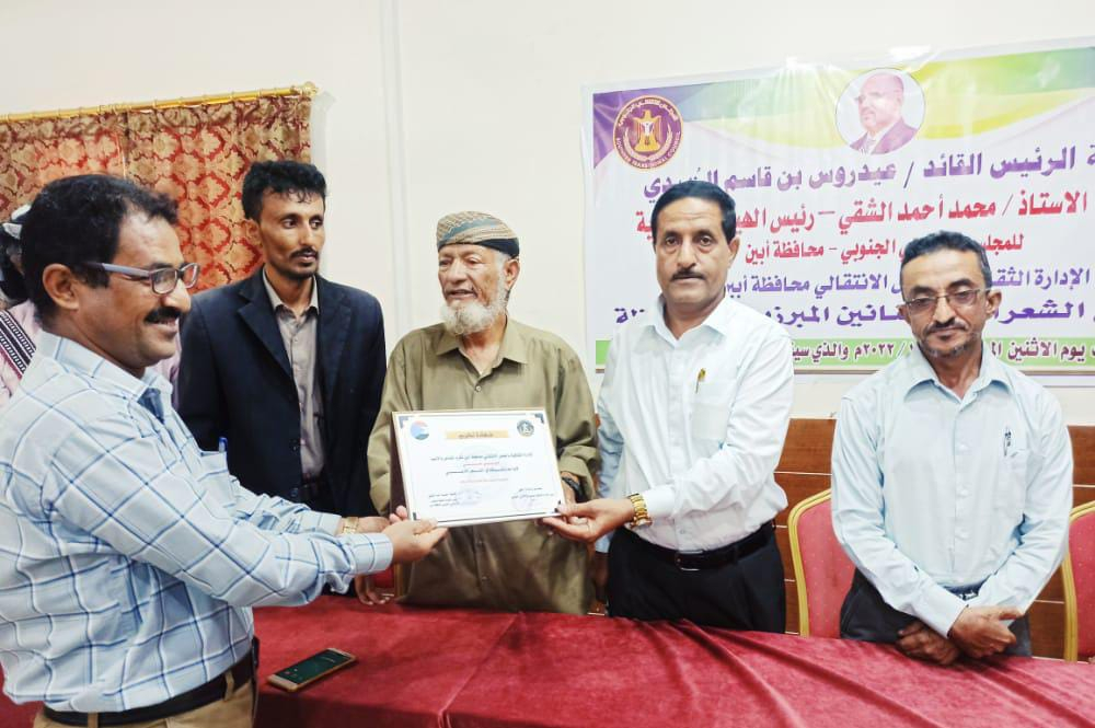 انتقالي أبين يُكرم عددًا من الشعراء والفنانين بالمحافظة كرمت الإدارة الثقافية لانتقالي محافظة أبين، اليوم الاثنين، عددا من الشعراء والفنانين بالمحافظة، برعا...
