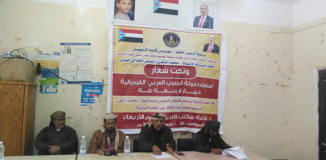 القيادة المحلية لانتقالي سرار يافع تعقد اجتماعها الموسع للفصل الرابع لعام 2022 عقدت القيادة المحلية للمجلس الانتقالي الجنوبي في مديرية سرار يافع بمحافظة أبين، اليوم الأربعاء، اجتم...