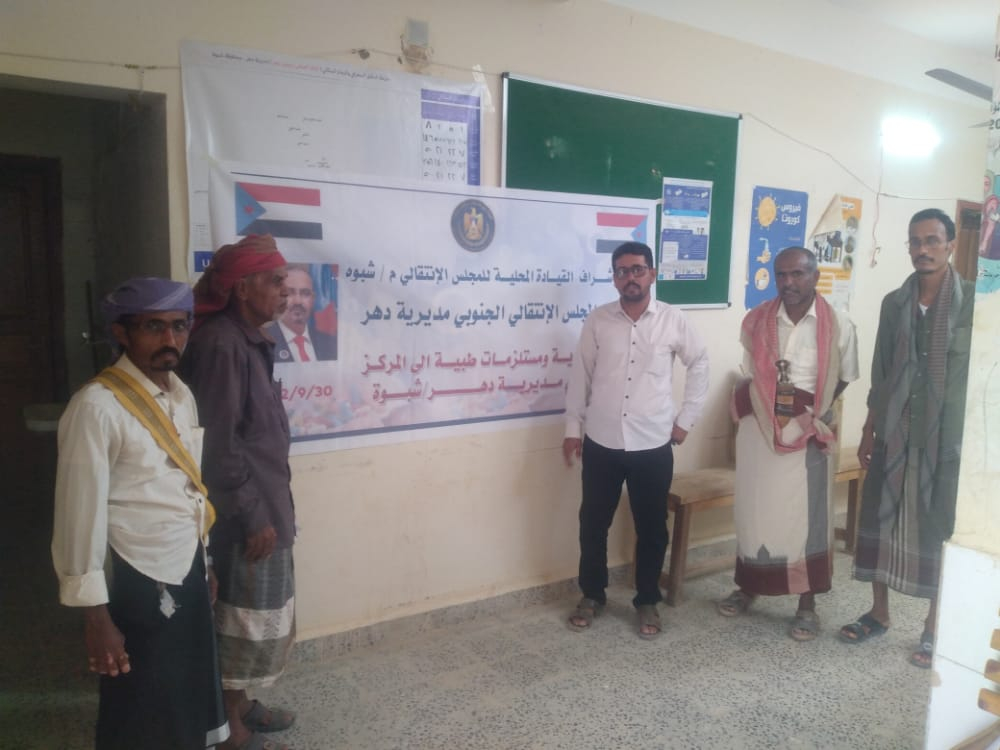 انتقالي دهر يرفد المركز الصحي بالمديرية بعدد من المستلزمات الطبية قدمت قيادة الهيئة التنفيذية للقيادة المحلية للمجلس الانتقالي الجنوبي بمديرية الدهر في محافظة شبوة، ا...