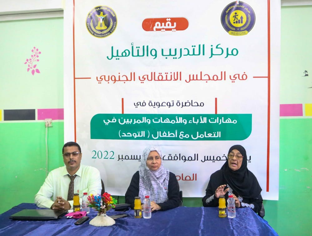 مركز التدريب والتأهيل ينظم محاضرة توعوية حول مهارات الآباء والأمهات والمربيين في التعامل مع أطفال التوحد نظم مركز التدريب والتأهيل في المجلس الانتقالي الجنوبي، اليوم الخميس، محاضرة توعوية حول مهارات الآباء...