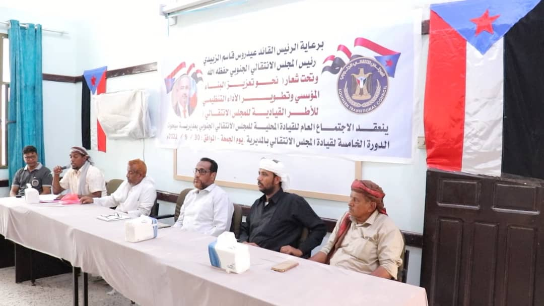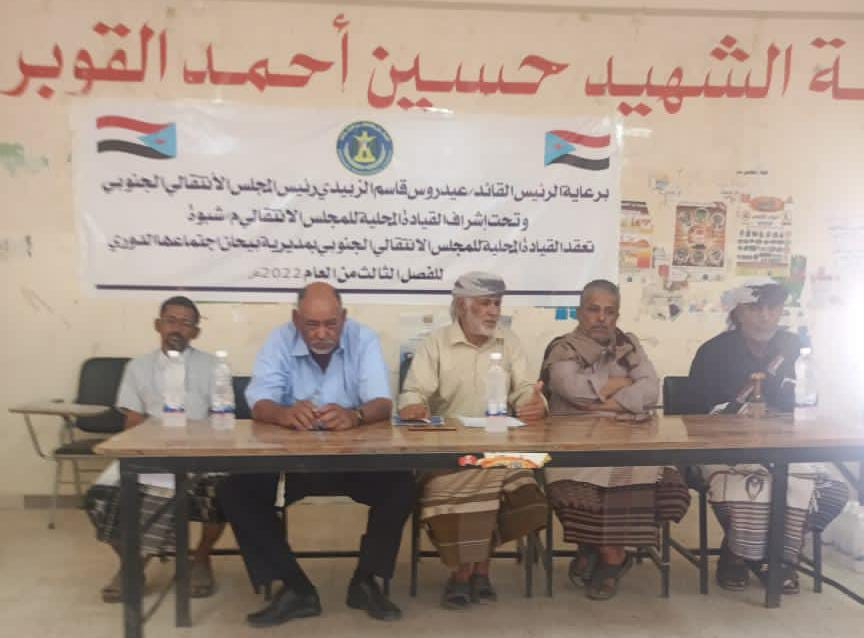 القيادة المحلية لانتقالي بيحان تعقد اجتماعها الموسع للفصل الثالث للعام 2022 عقدت القيادة المحلية للمجلس الانتقالي الجنوبي بمديرية بيحان ، اليوم السبت ، اجتماعها الموسع للفصل ال...