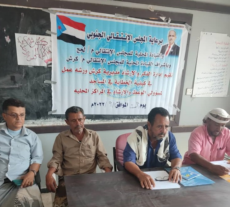 انتقالي كرش يُقيم ورشة حول "ترشيد الخطاب الديني" لمسؤولي الوعظ والإرشاد أقامت إدارة الفكر والإرشاد بالهيئة التنفيذية للمجلس الانتقالي الجنوبي في مديرية كرش بمحافظة لحج، الي...