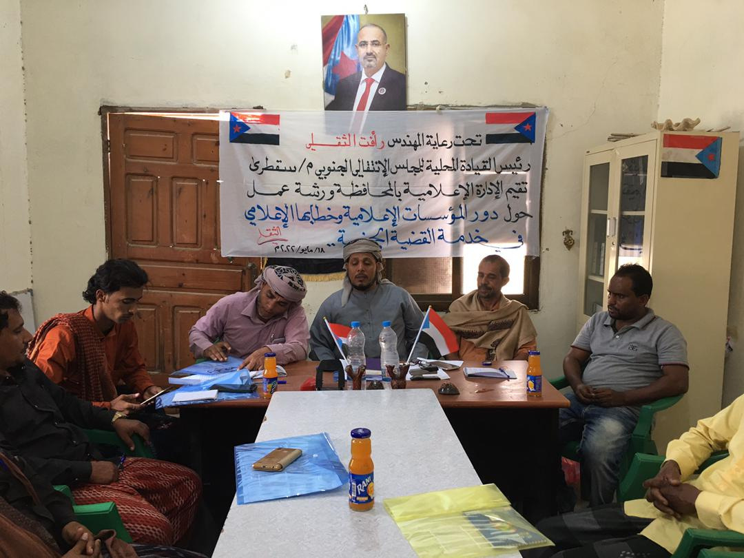 ورشة عمل في سقطرى حول " دور المؤسسات الإعلامية بخطابها الإعلامي في خدمة القضية الجنوبية" اقامت الإدارة الإعلامية بالهيئة التنفيذية للقيادة المحلية للمجلس الانتقالي الجنوبي اليوم الأربعاء، ف...