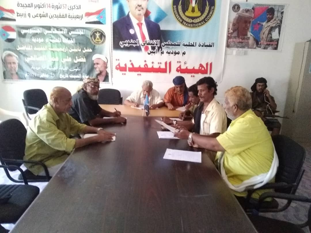 تنفيذية انتقالي مودية تعقد اجتماعها الدوري الثاني لشهر نوفمبر عقدت الهيئة التنفيذية للقيادة المحلية في المجلس الانتقالي الجنوبي بمديرية مودية في محافظة أبين، اليو...