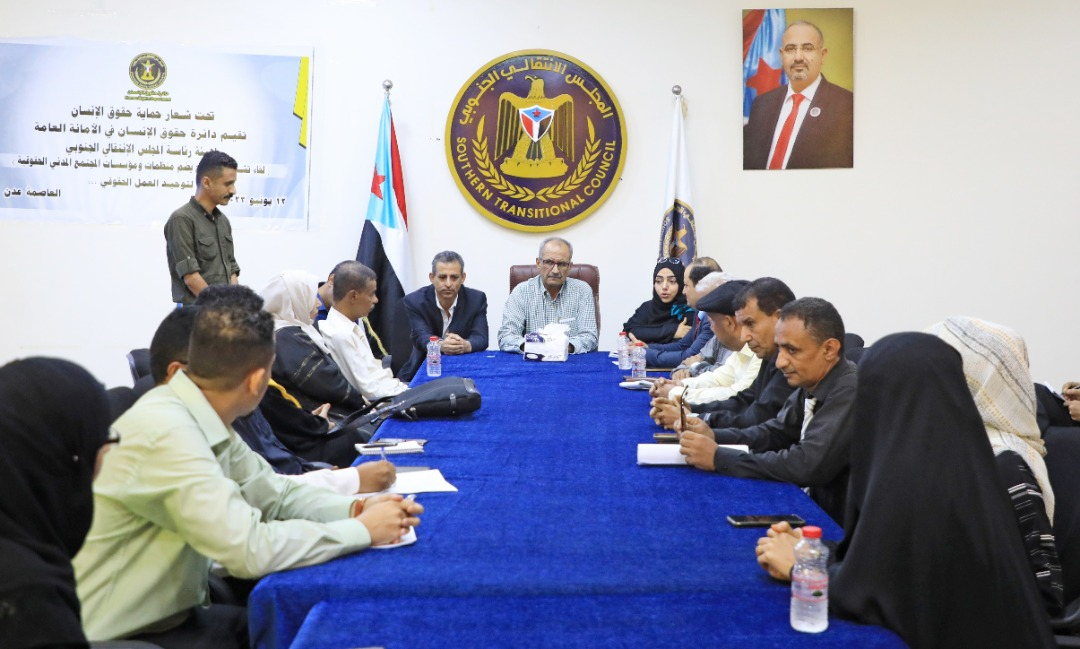دائرة حقوق الإنسان تنظم لقاء تشاورياً موسعاً مع منظمات ومؤسسات مجتمع مدني حقوقية جنوبية نظمت دائرة حقوق الإنسان في الأمانة العامة لهيئة رئاسة المجلس الانتقالي الجنوبي، اليوم الأحد، لقاء تش...