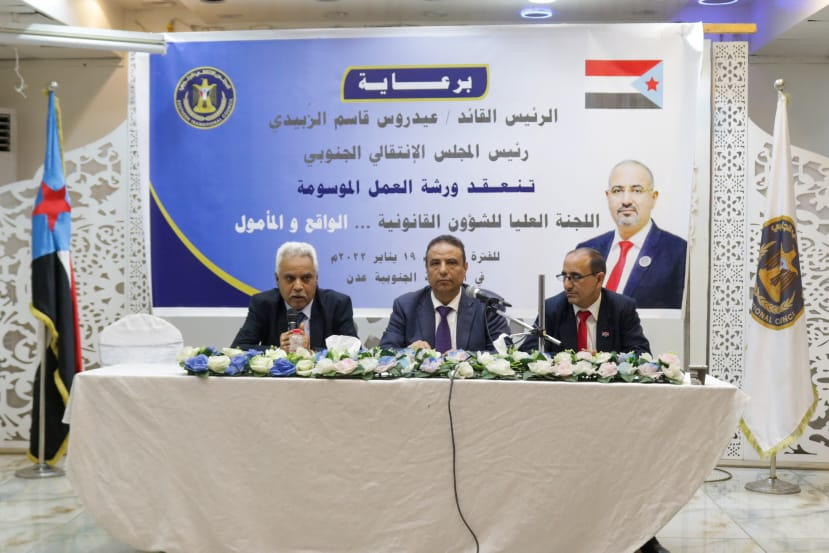اللجنة العليا للشؤون القانونية تختتم ورشة عملها "اللجنة العليا للشؤون القانونية.. الواقع والمأمول" اختتمت اللجنة العليا للشؤون القانونية في المجلس الانتقالي الجنوبي، اليوم الأربعاء، بالعاصمة عدن، ورش...