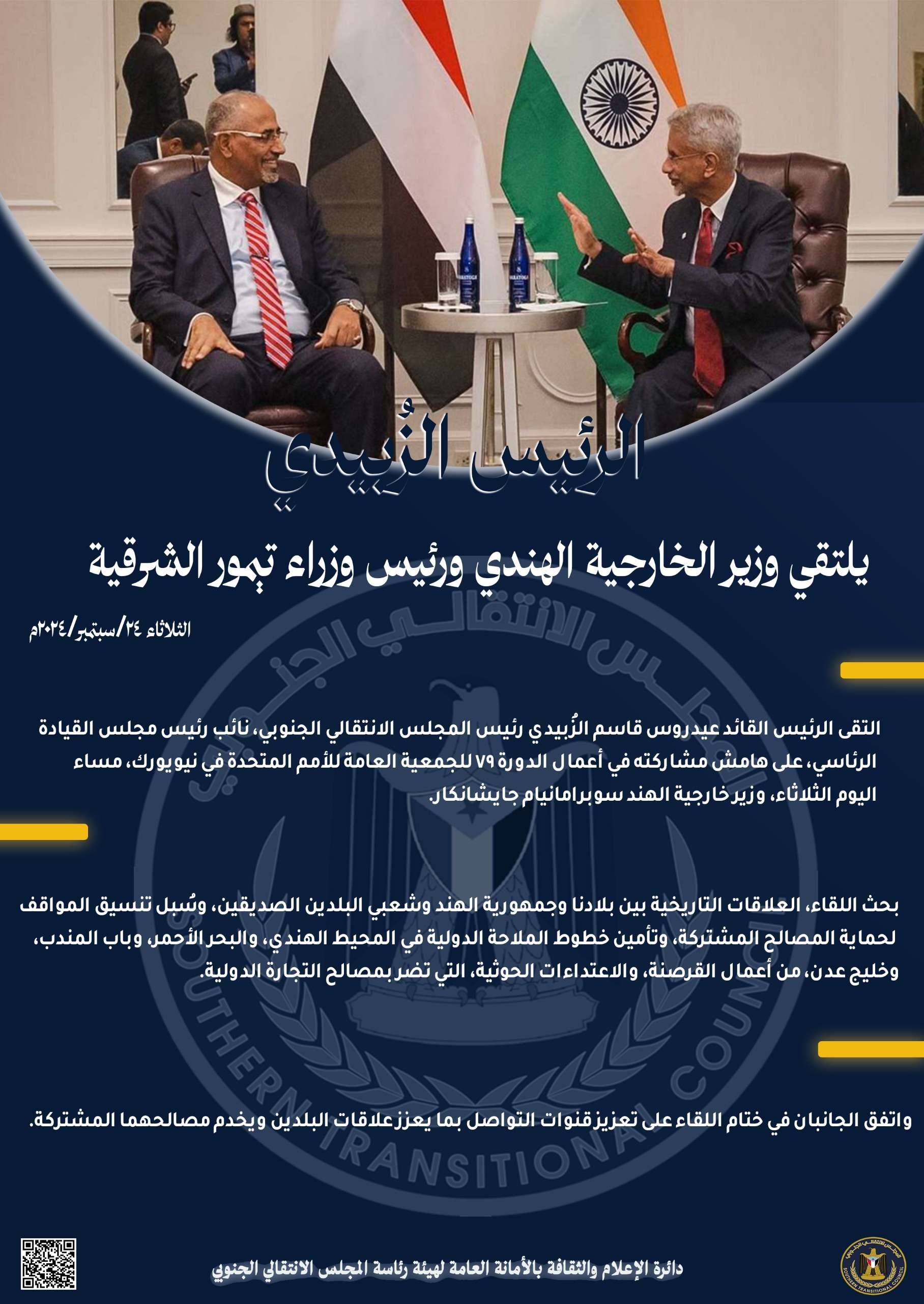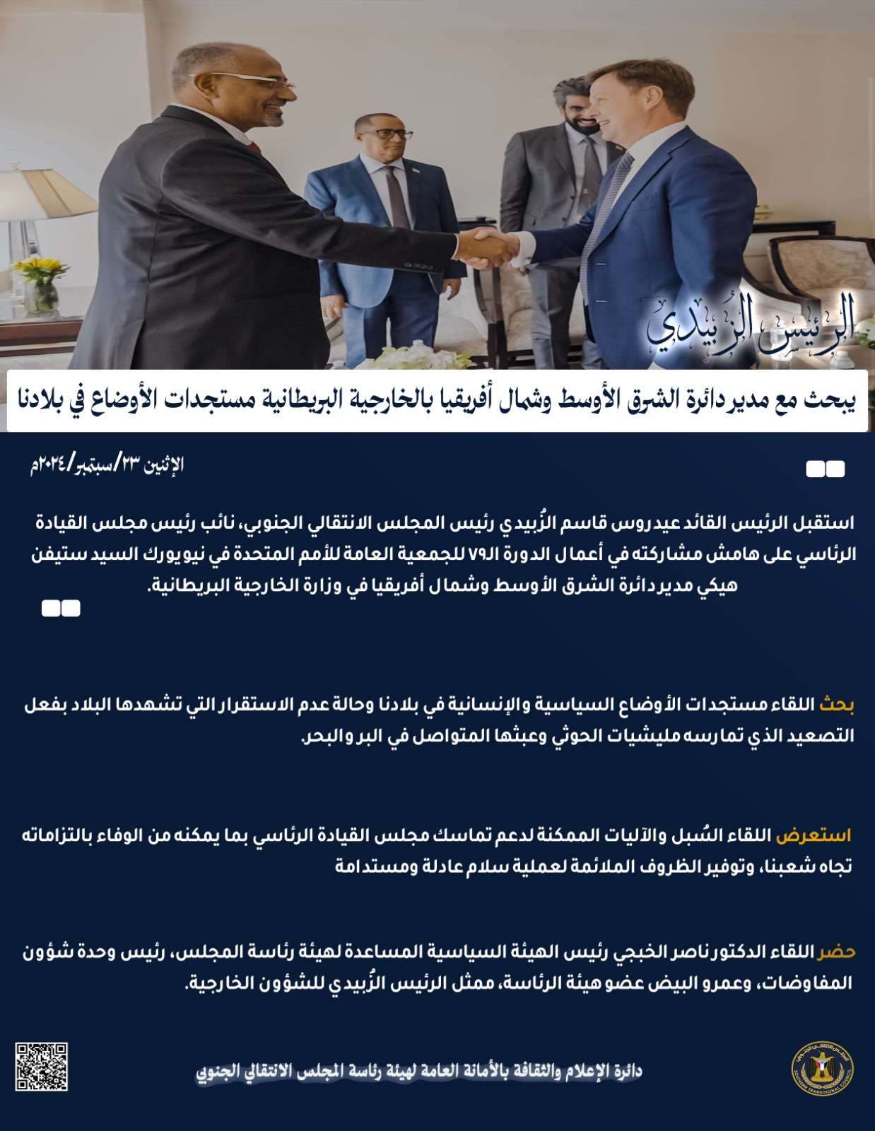 الرئيس الزُبيدي يبحث مع مدير دائرة الشرق الأوسط وشمال أفريقيا بالخارجية البريطانية مستجدات الأوضاع ا...