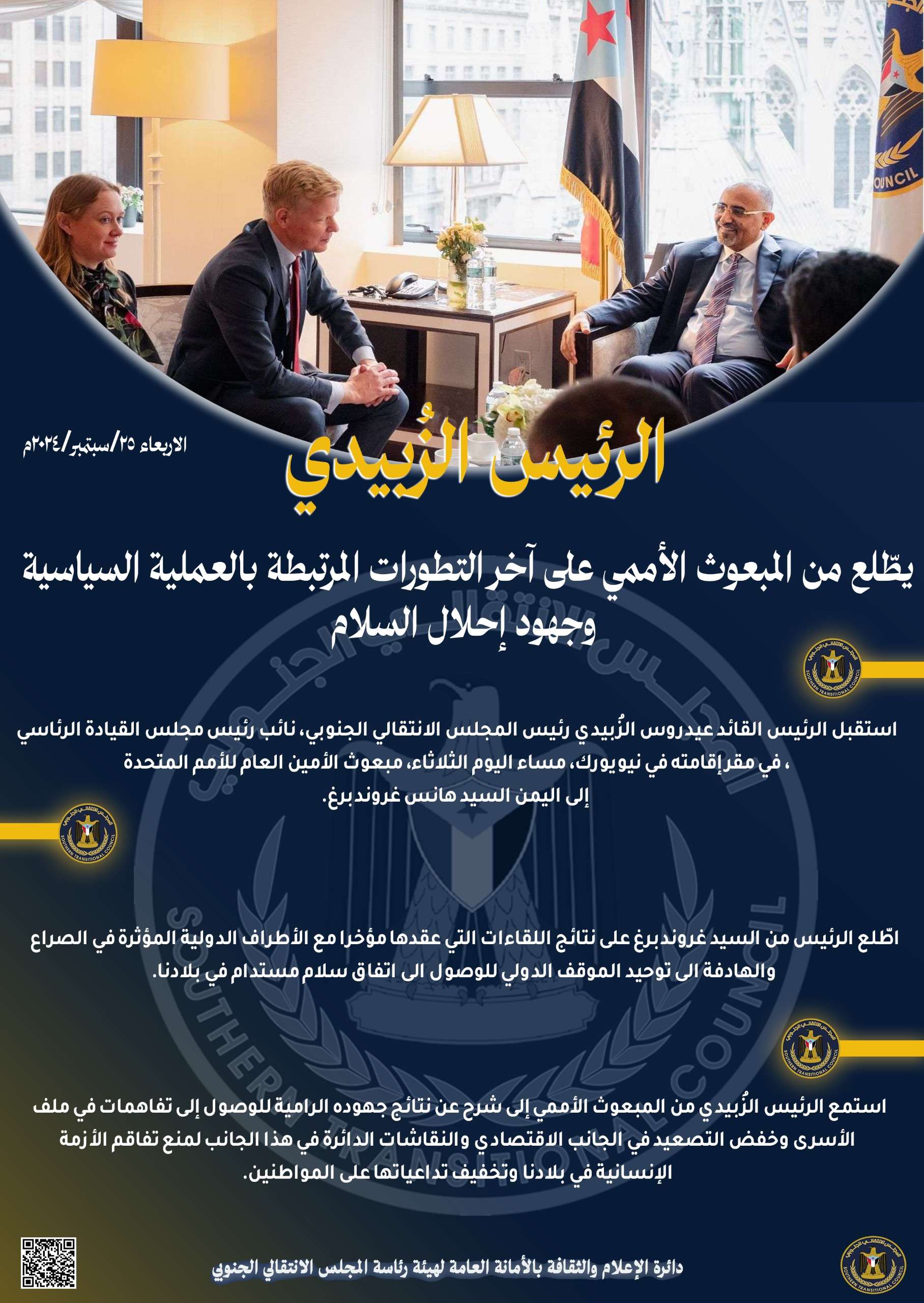الرئيس الزُبيدي يطّلع من المبعوث الأممي على آخر التطورات المرتبطة بالعملية السياسية وجهود إحلال السل...