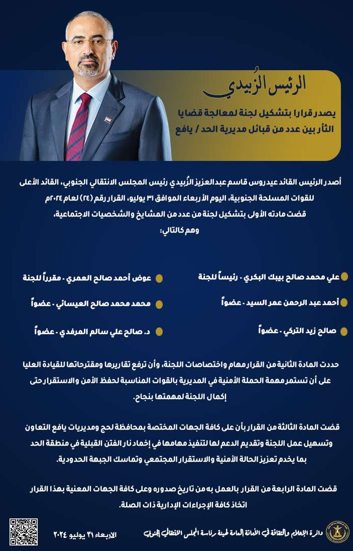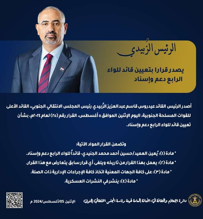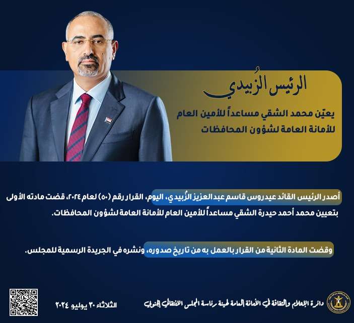 صدور قرار رئيس المجلس الانتقالي الجنوبي رقم (50) لعام 2024م بشأن تعيين مساعد الأمين العام للأمانة ال...