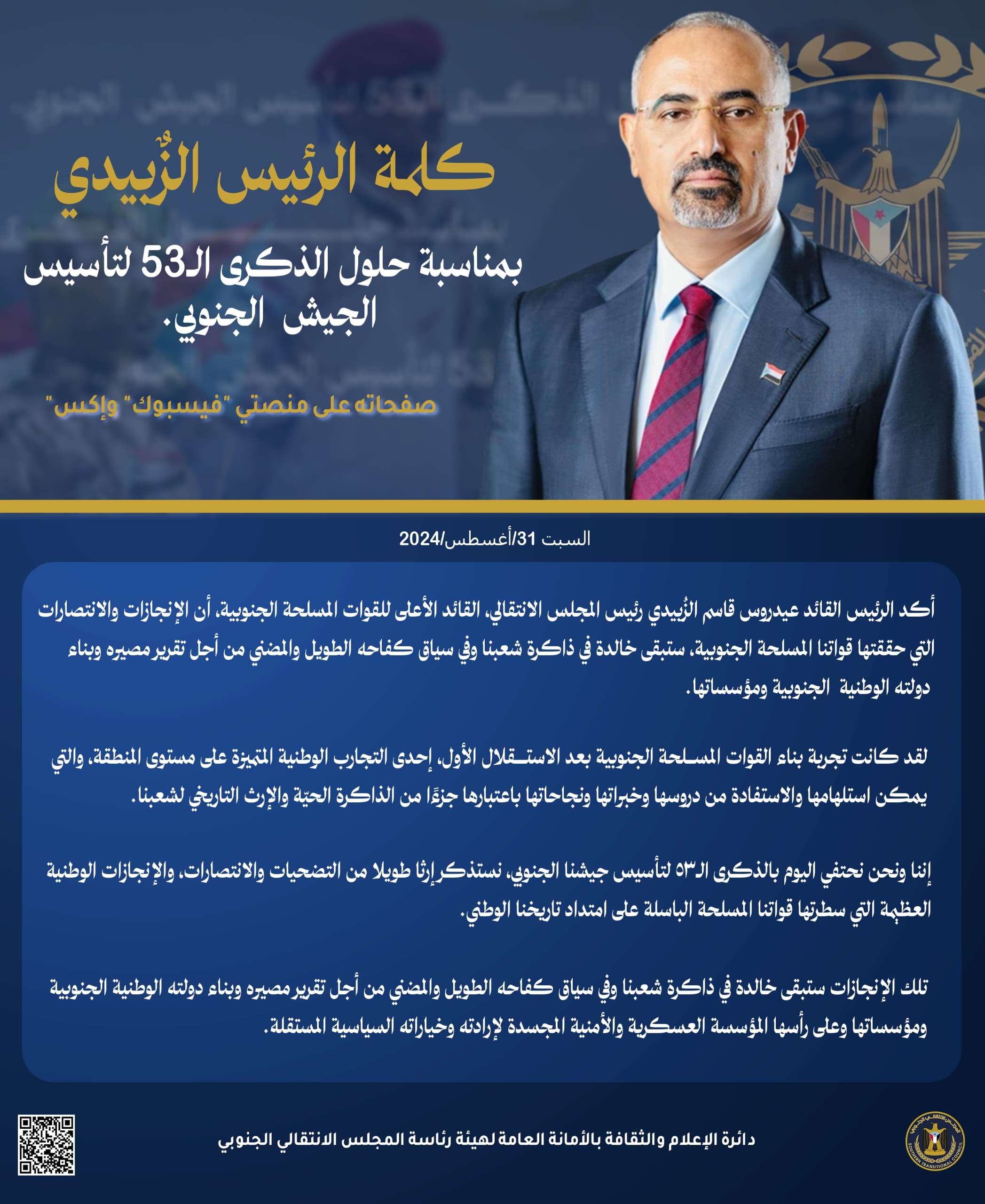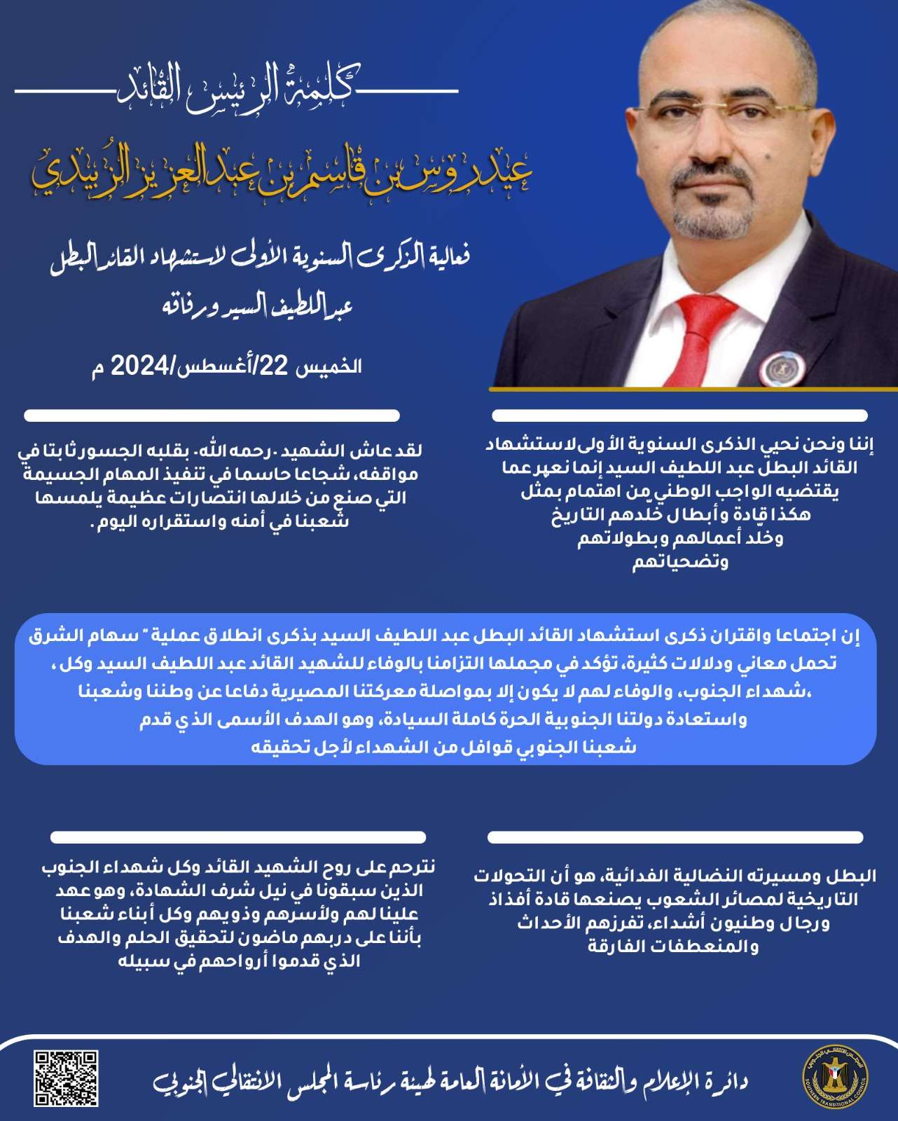 الرئيس الزُبيدي يلقي كلمة في فعالية الذكرى السنوية الأولى لاستشهاد القائد البطل عبداللطيف السيد ورفا...