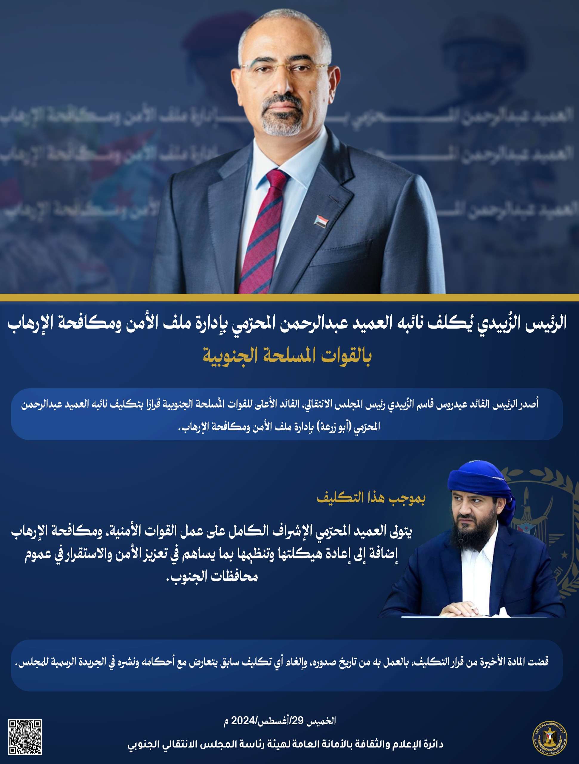 الرئيس الزُبيدي يُكلف نائبه العميد عبدالرحمن المحرّمي بإدارة ملف الأمن ومكافحة الإرهاب بالقوات المسل...