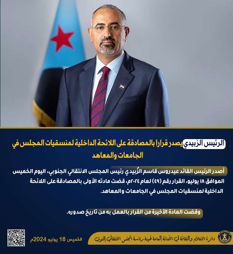 صدور قرار رئيس المجلس الانتقالي الجنوبي رقم (50) لعام 2024م بشأن تعيين مساعد الأمين العام للأمانة ال...