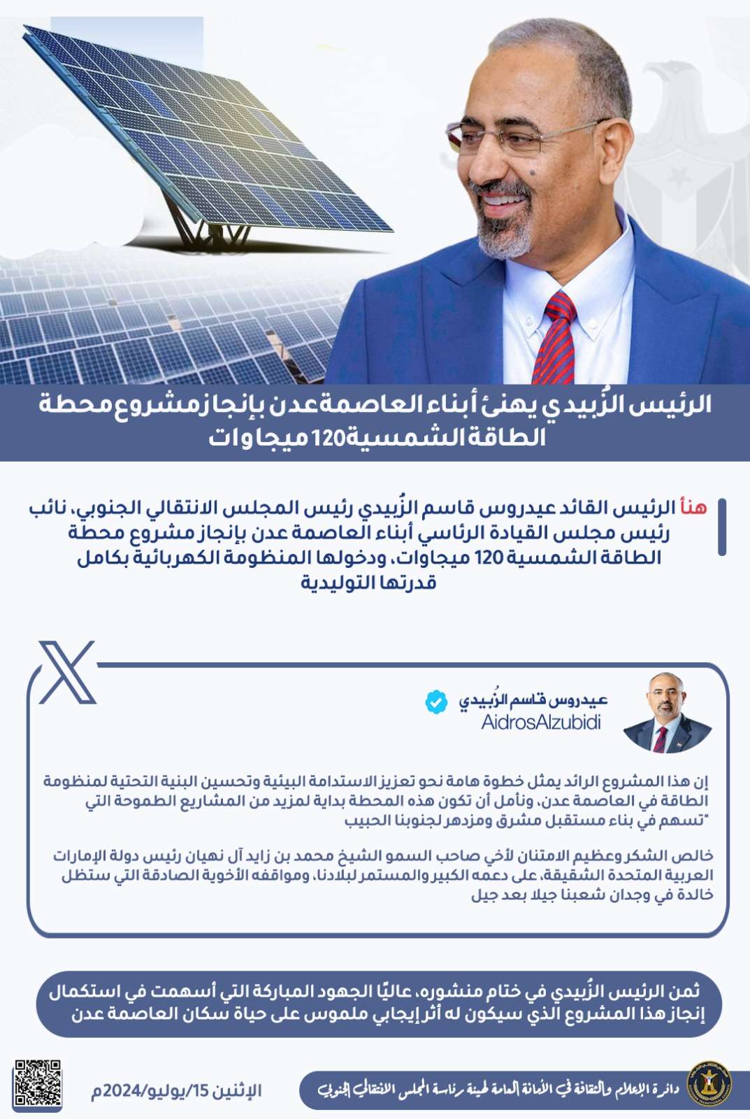 الرئيس الزُبيدي يهنئ أبناء العاصمة عدن بإنجاز مشروع محطة الطاقة الشمسية 120 ميجاوات