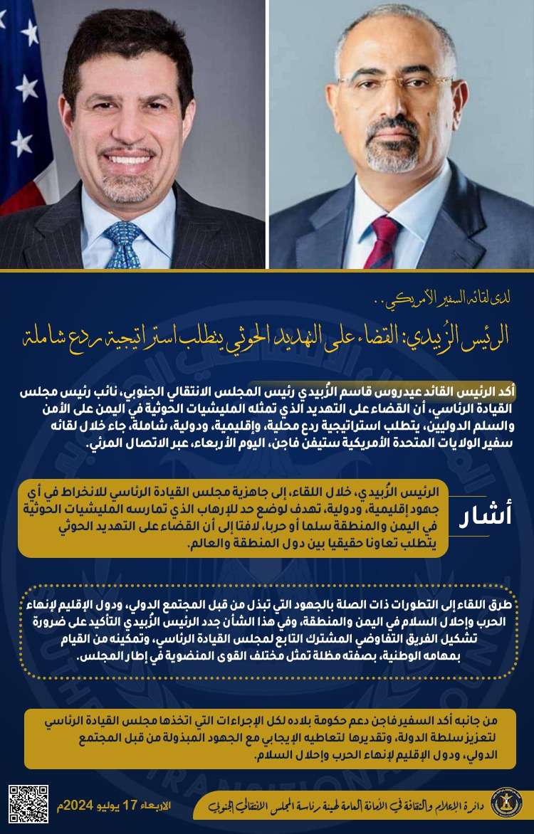 لدى لقائه السفير الأمريكي.. الرئيس الزُبيدي: القضاء على التهديد الحوثي يتطلب استراتيجية ردع شاملة