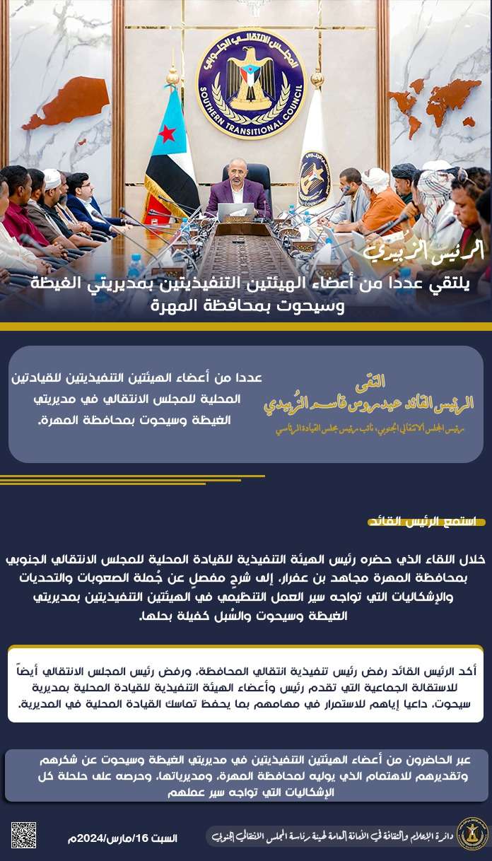صدور قرار رئيس المجلس الانتقالي الجنوبي رقم (41) لعام 2024 بشأن إضافة أعضاء إلى قوام عضوية مجلس المس...