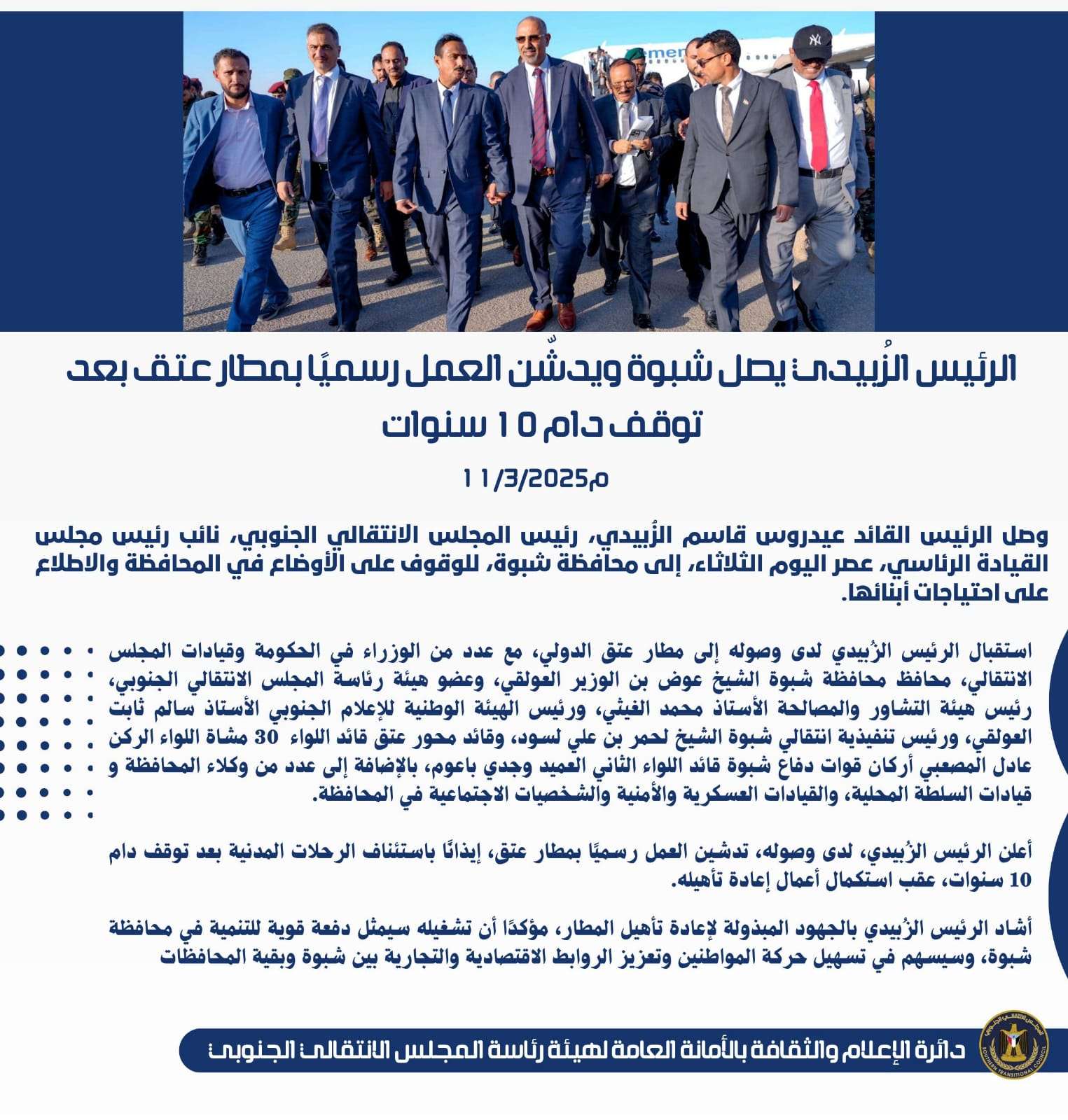 الرئيس الزُبيدي يصل شبوة ويدشّن العمل رسميًا بمطار عتق بعد توقف دام 10 سنوات