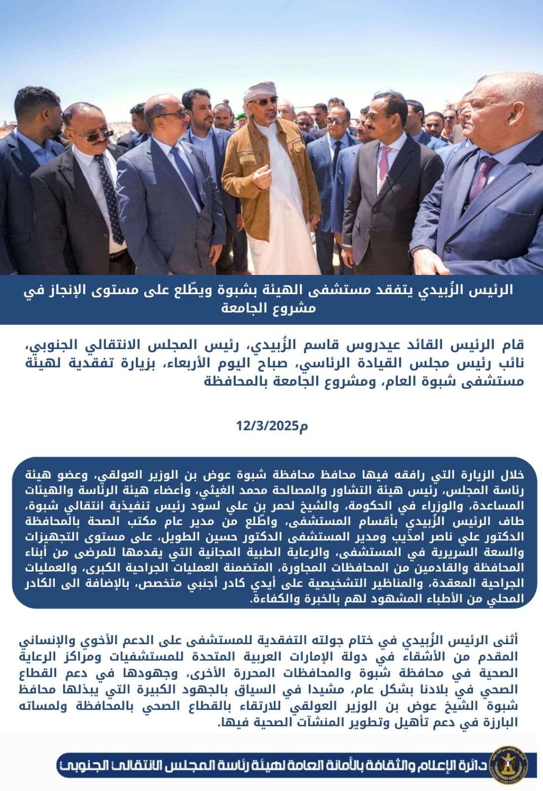 الرئيس الزُبيدي يتفقد مستشفى الهيئة بشبوة ويطّلع على مستوى الإنجاز في مشروع الجامعة