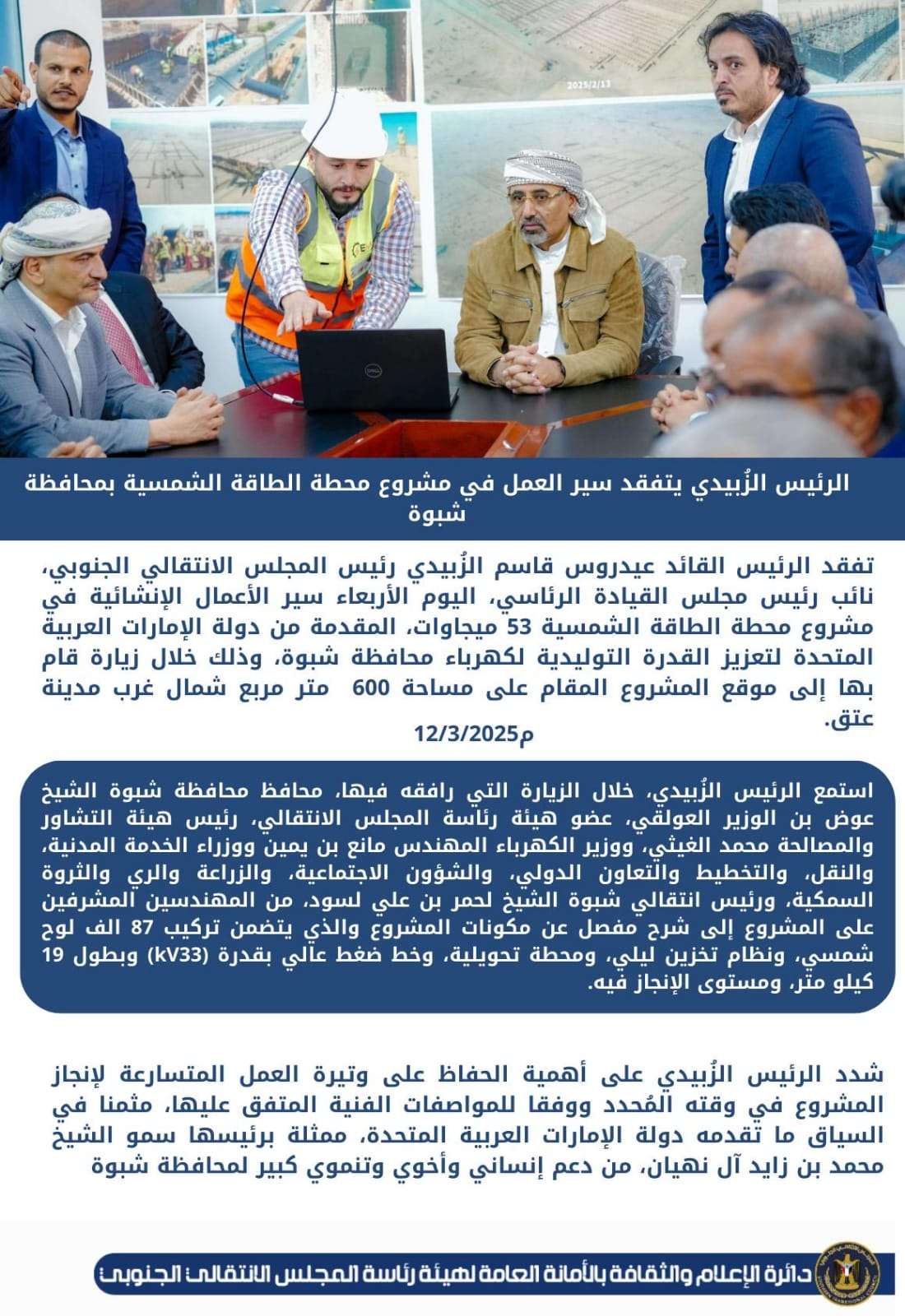 الرئيس الزُبيدي يتفقد سير العمل في مشروع الطاقة الشمسية بمحافظة شبوة