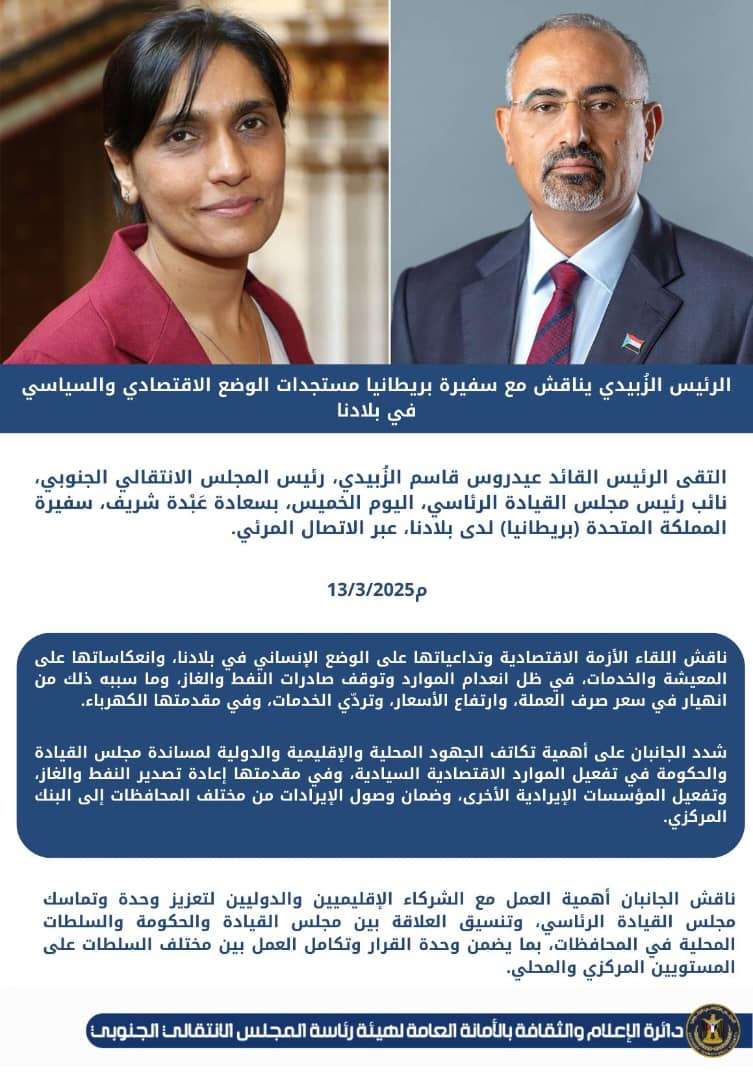 الرئيس الزُبيدي يناقش مع سفيرة بريطانيا مستجدات الوضع الاقتصادي والسياسي في بلادنا