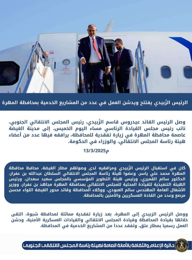 الرئيس الزُبيدي يصل محافظة المهرة في زيارة تفقدية للمحافظة