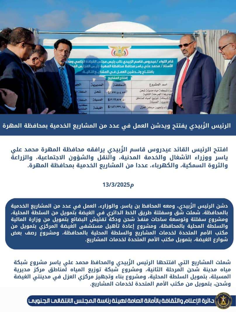 الرئيس الزُبيدي يفتتح ويدشن العمل في عدد من المشاريع الخدمية بمحافظة المهرة