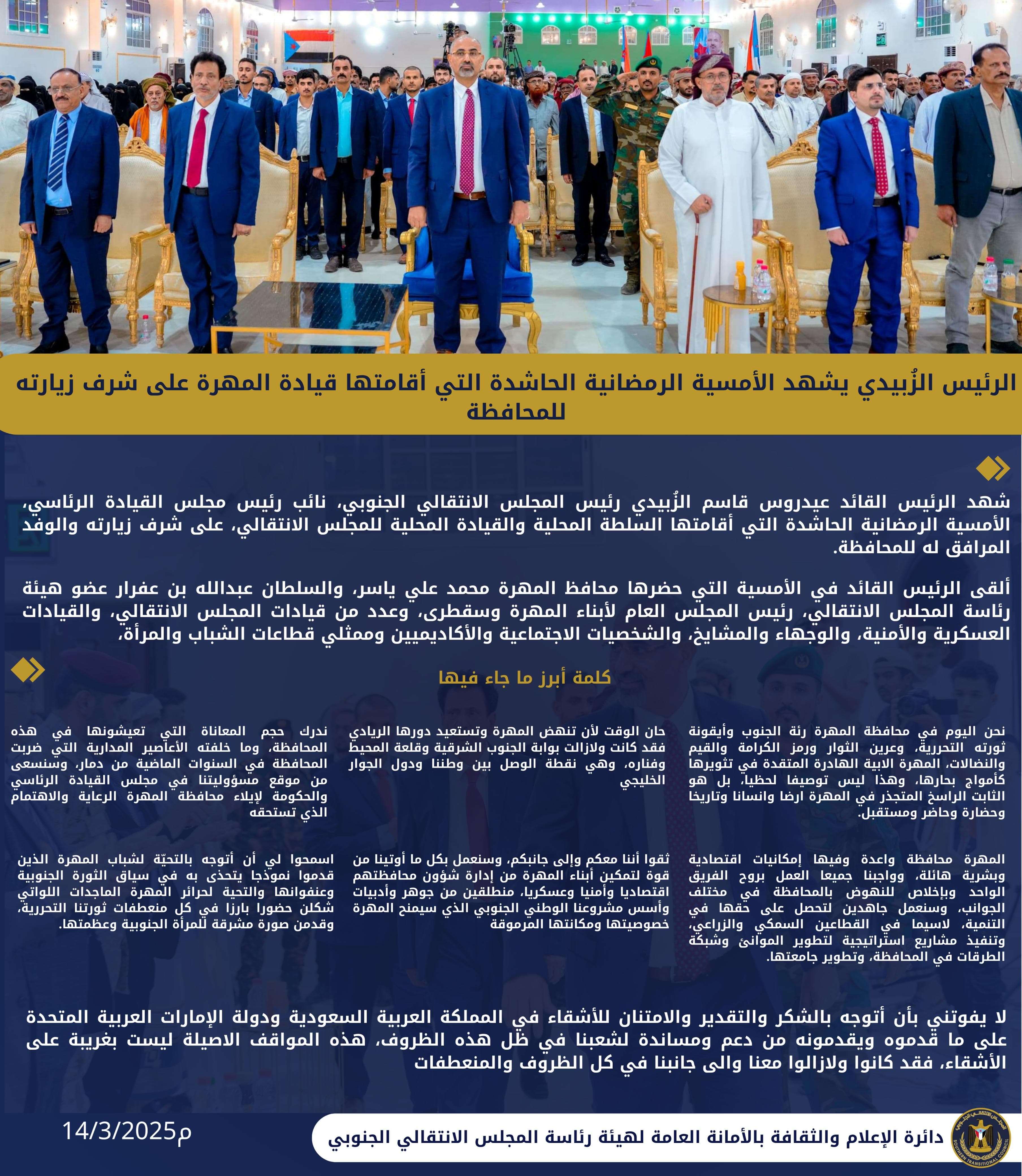 الرئيس الزُبيدي يشهد الأمسية الرمضانية الحاشدة التي أقامتها قيادة المهرة على شرف زيارته للمحافظة