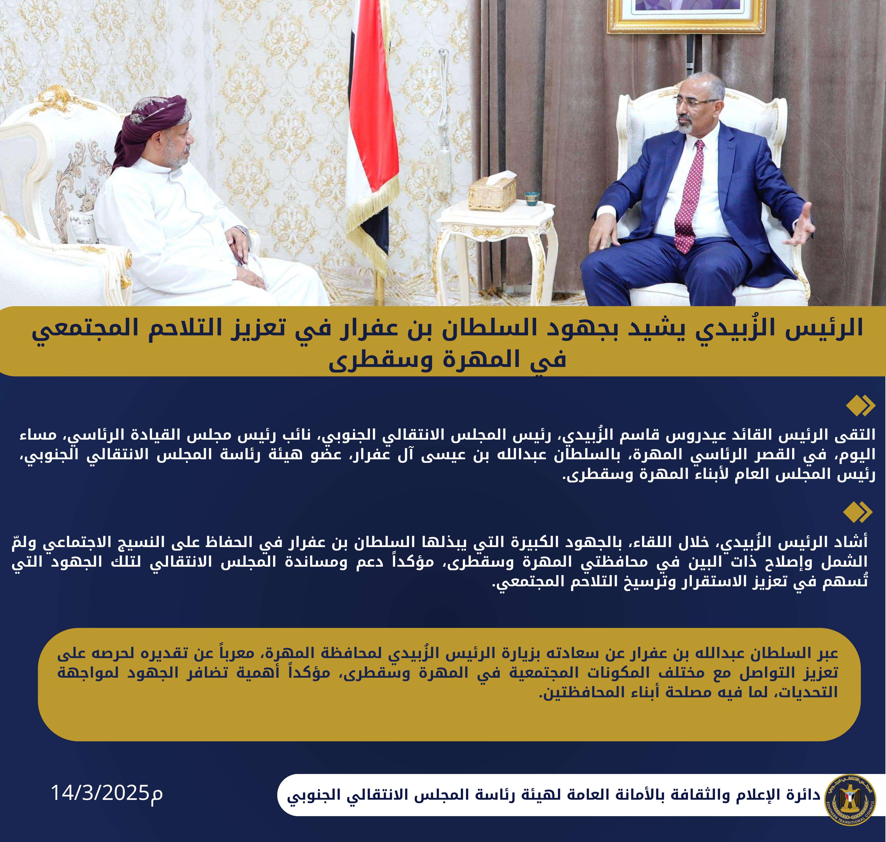 الرئيس الزُبيدي يشيد بجهود السلطان بن عفرار في تعزيز التلاحم المجتمعي في المهرة وسقطرى