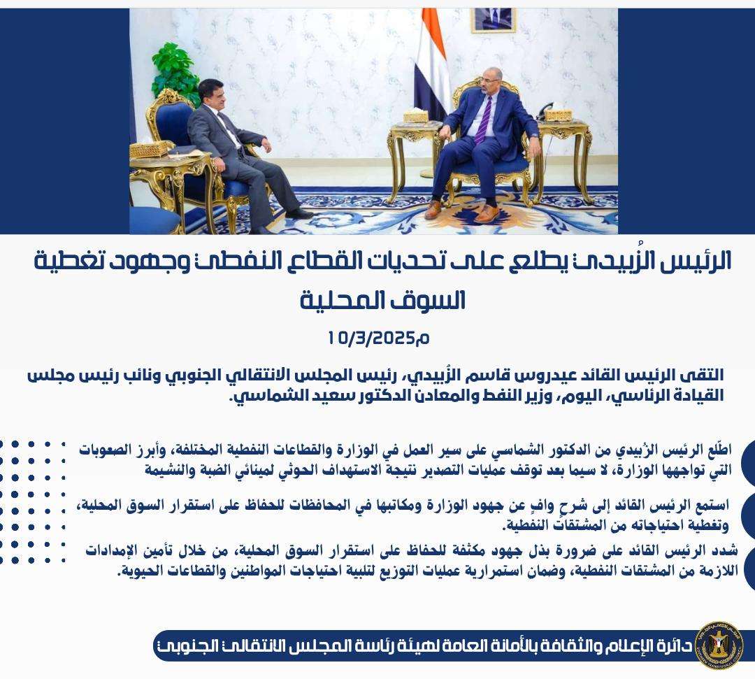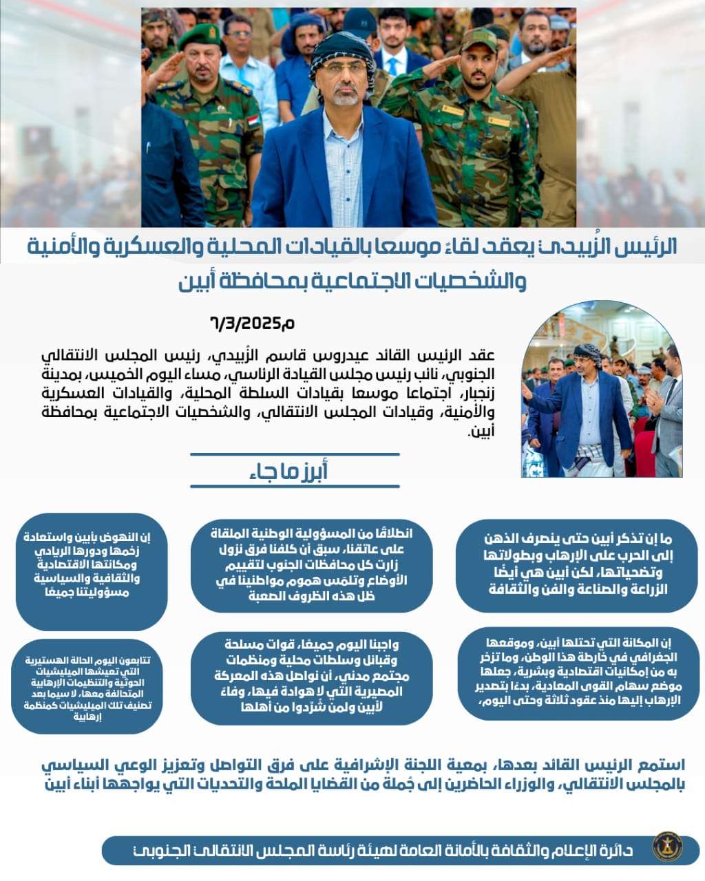 الرئيس الزُبيدي يعقد لقاءً موسعا بالقيادات المحلية والعسكرية والأمنية والشخصيات الاجتماعية بمحافظة أ...