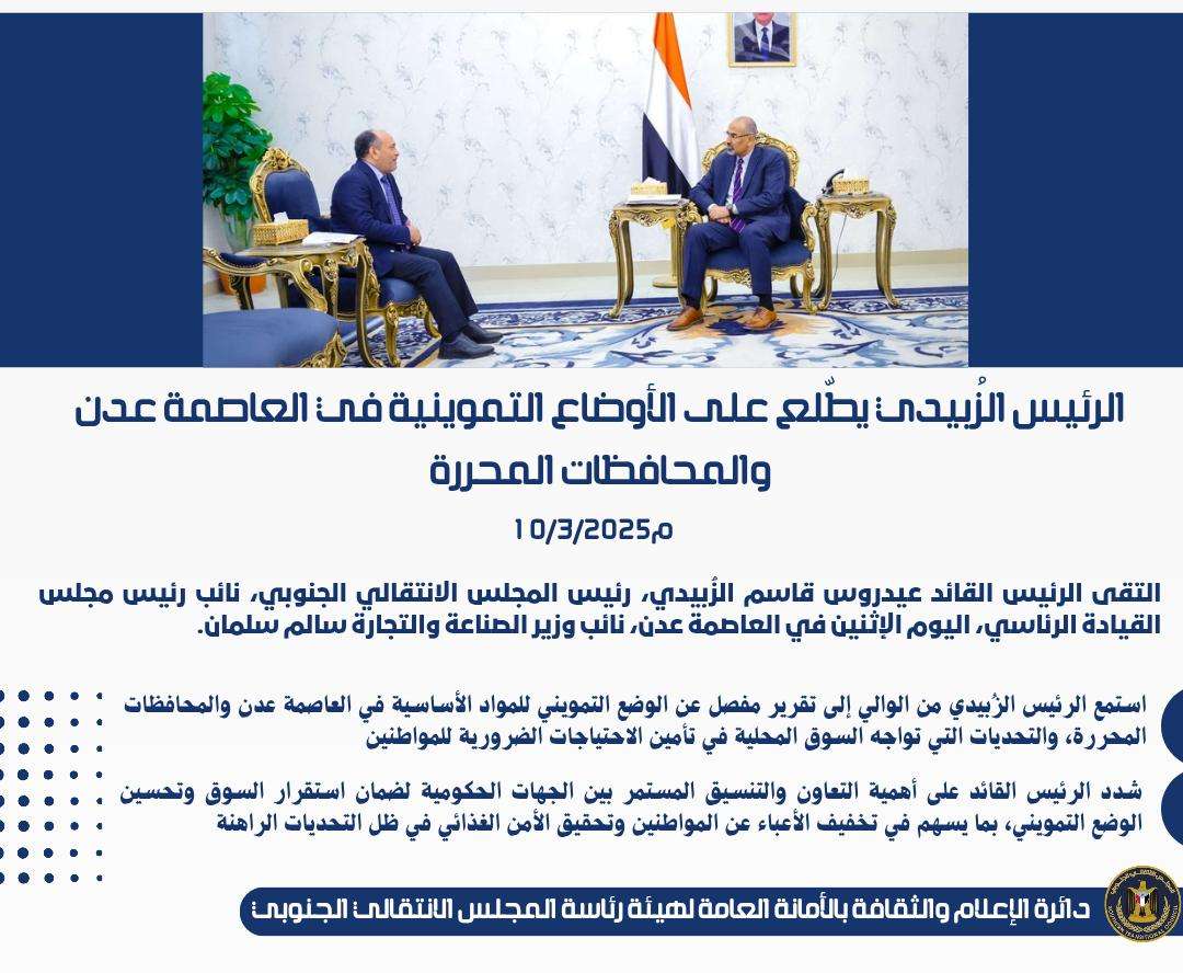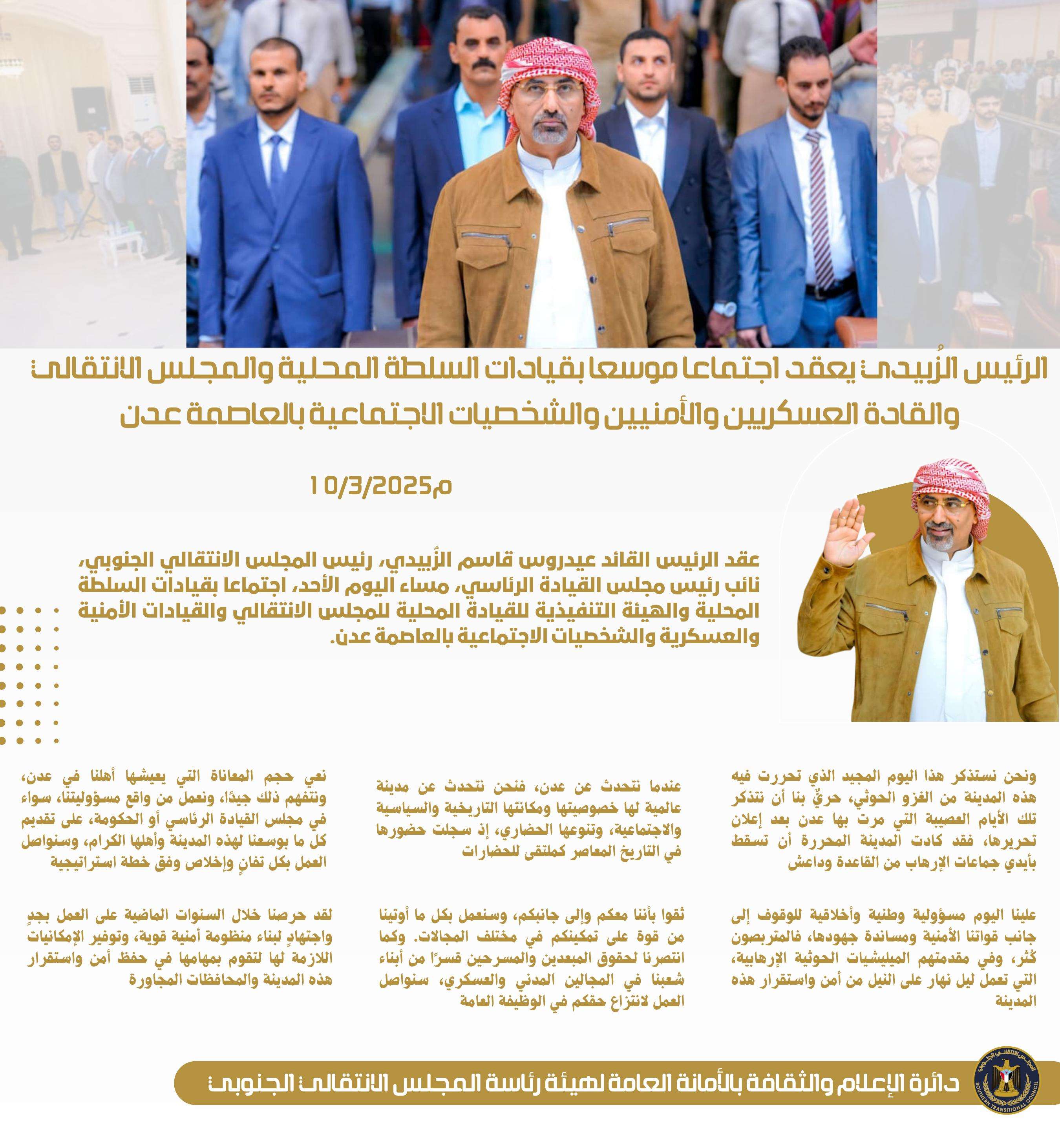 الرئيس الزُبيدي يعقد اجتماعا موسعا بقيادات السلطة المحلية والمجلس الانتقالي والقادة العسكريين والأمن...