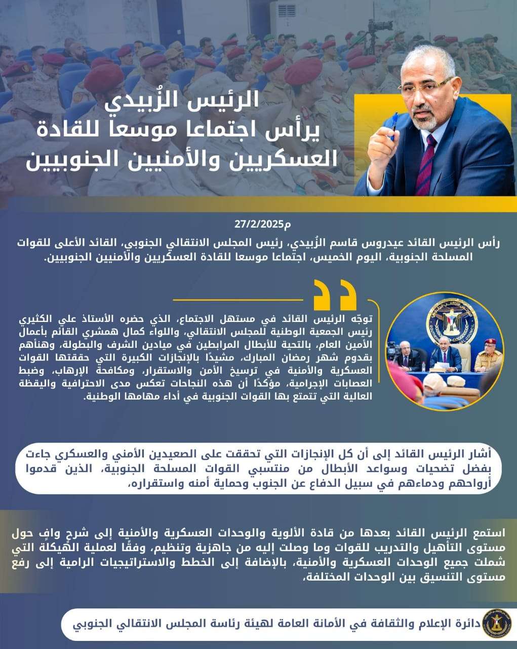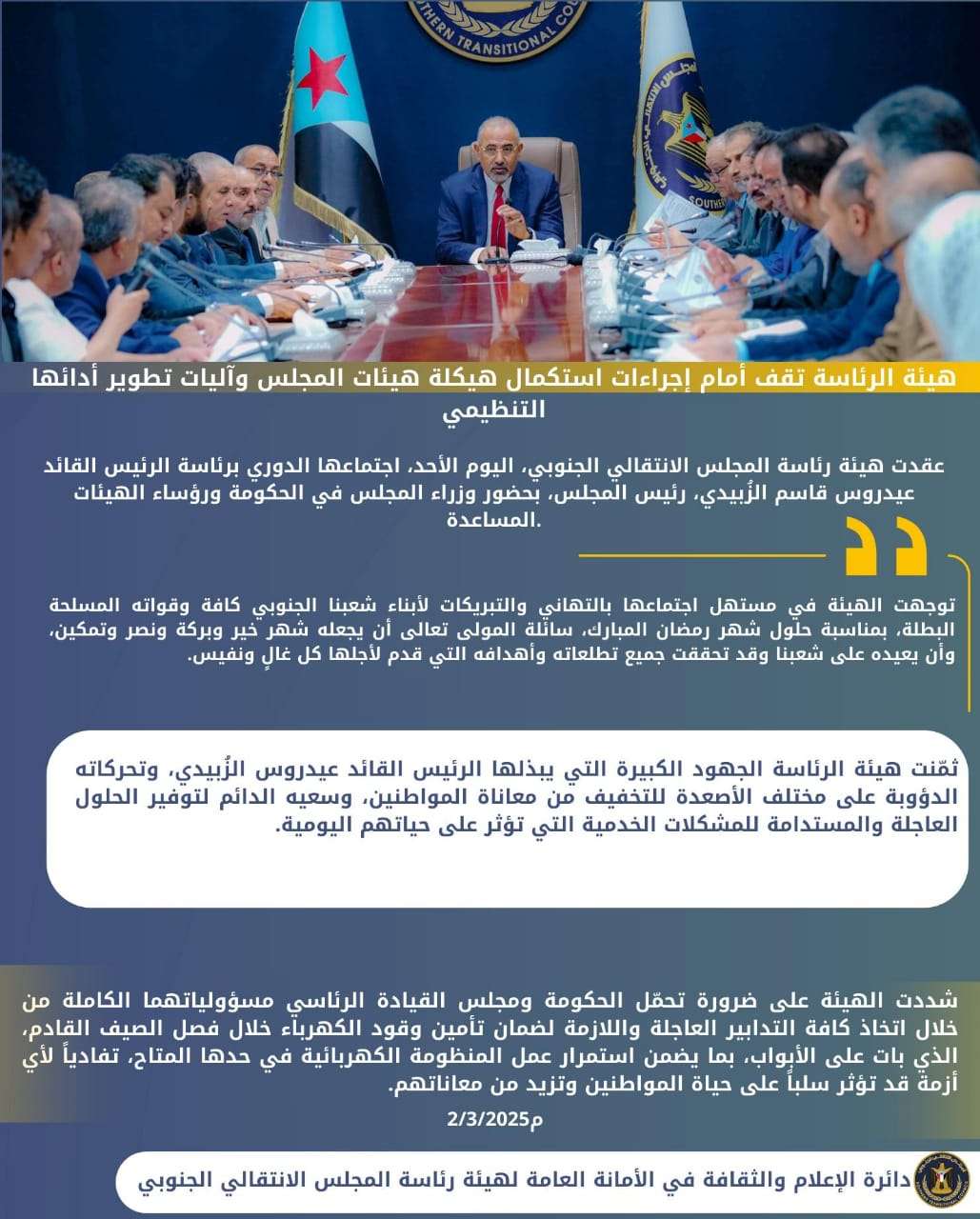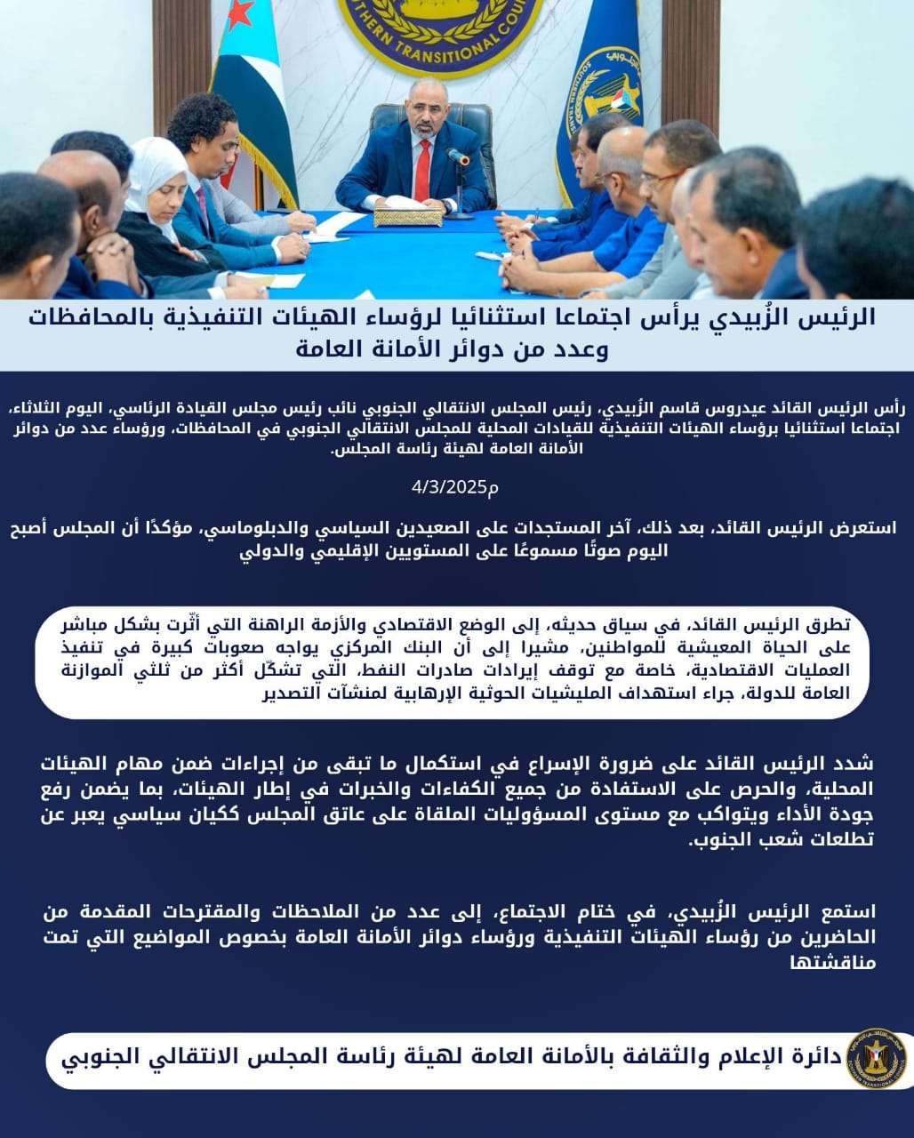 الرئيس الزُبيدي يرأس اجتماعا استثنائيا لرؤساء الهيئات التنفيذية بالمحافظات وعدد من دوائر الأمانة الع...