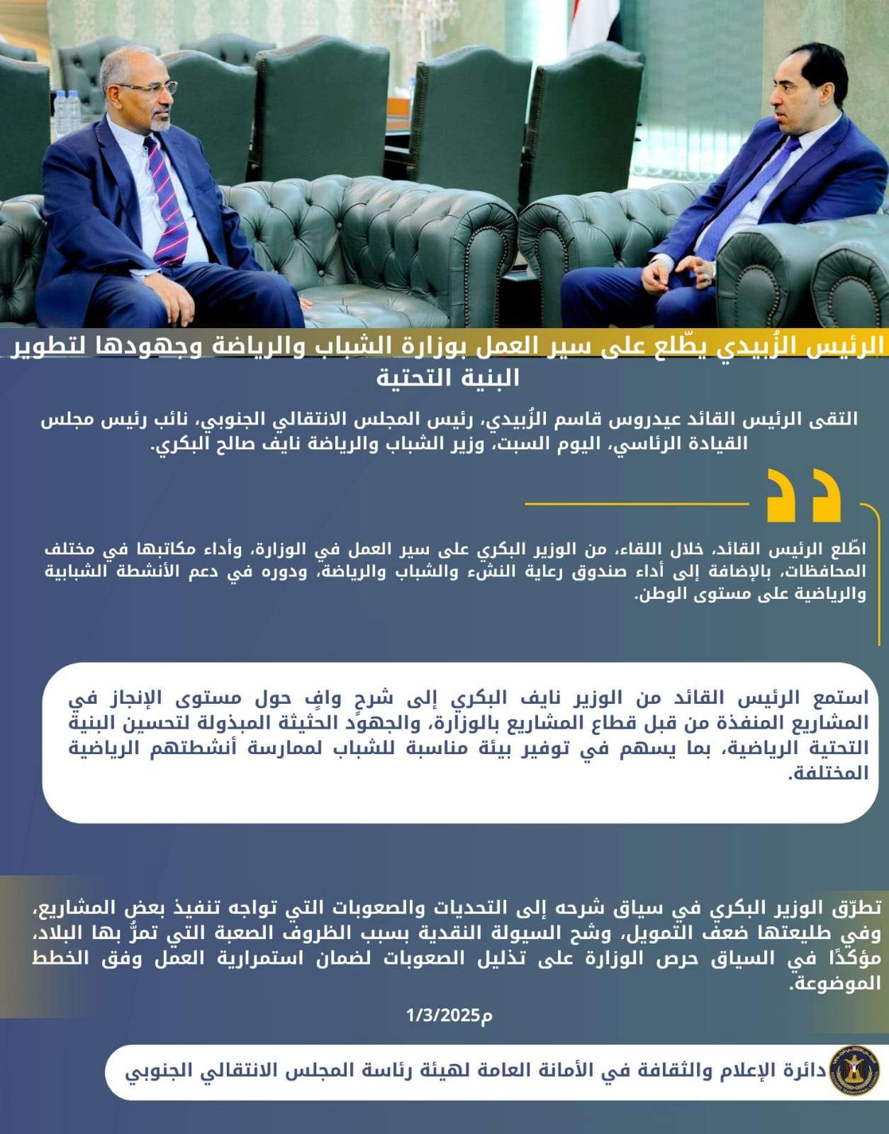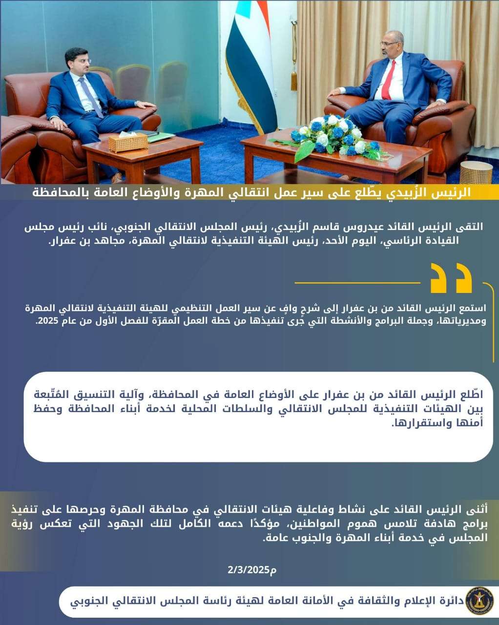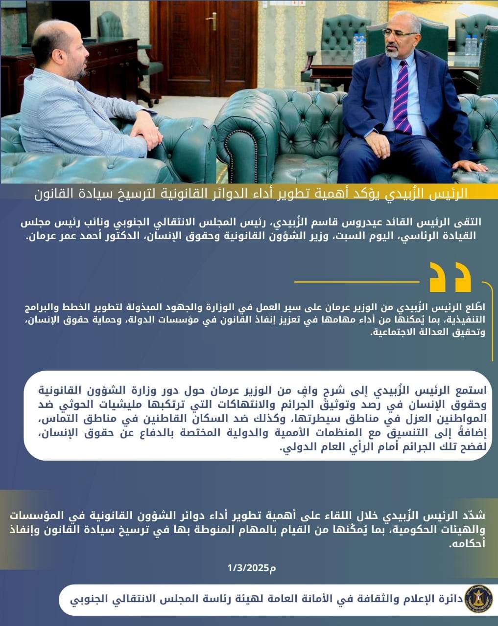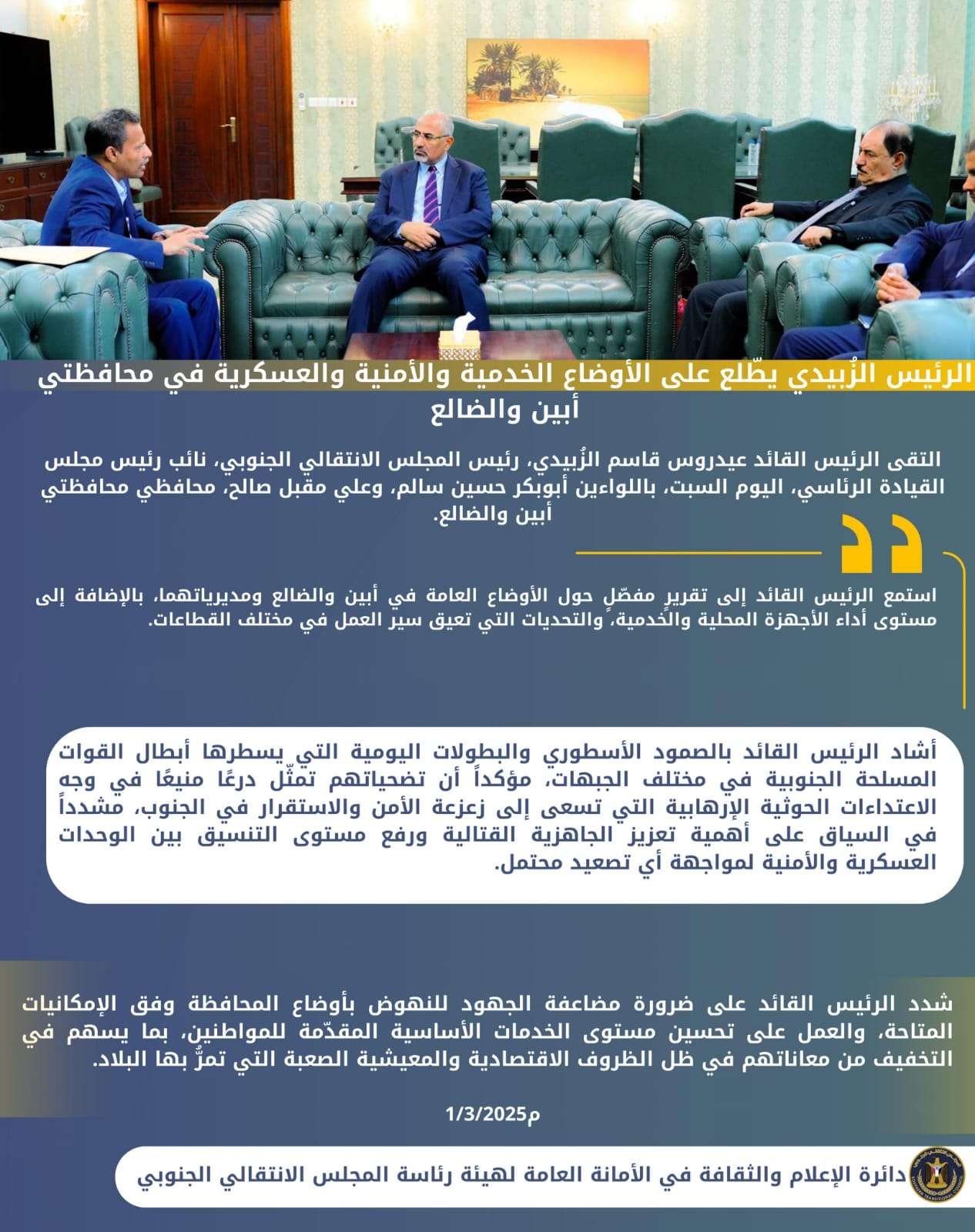 الرئيس الزُبيدي يرأس اجتماعا استثنائيا لرؤساء الهيئات التنفيذية بالمحافظات وعدد من دوائر الأمانة الع...