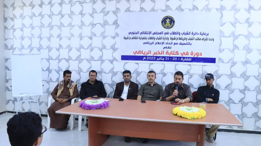 انتقالي شبوة يدشن دورة في كتابة الخبر الرياضي لإعلاميي أندية المحافظة دشنت إدارة الشباب والطلاب لانتقالي شبوة، اليوم الإثنين، دورة في كتابة الخبر الرياضي لإعلاميي أندية ا...