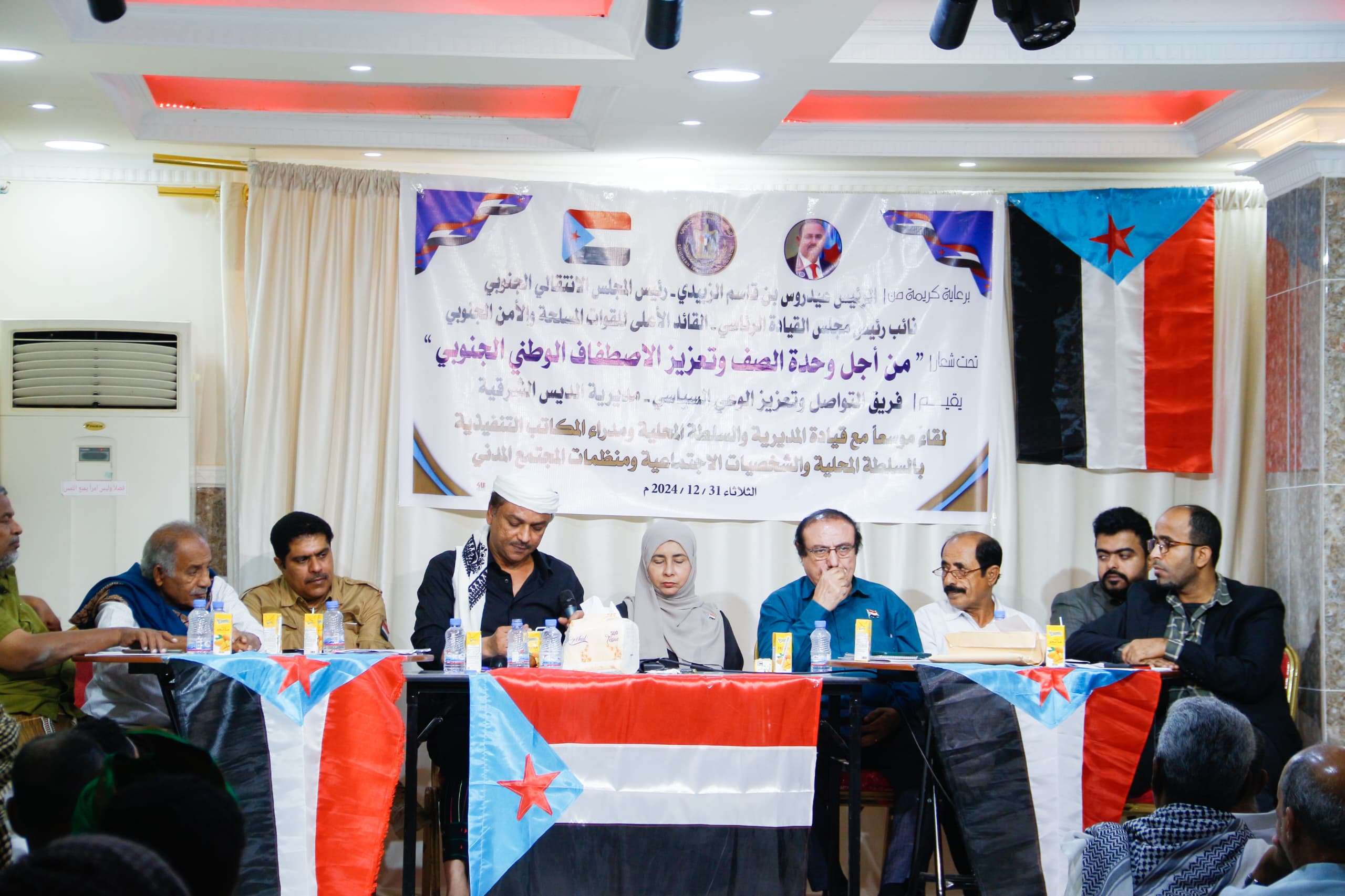 فريق التواصل وتعزيز الوعي السياسي بالمجلس يعقد لقاءً موسعًا مع قيادة المجلس والسلطة المحلية بمديرية الروضة عقد فريق التواصل وتعزيز الوعي السياسي بالمجلس الانتقالي الجنوبي، برئاسة عضو هيئة الرئاسة، الشيخ عبدا...