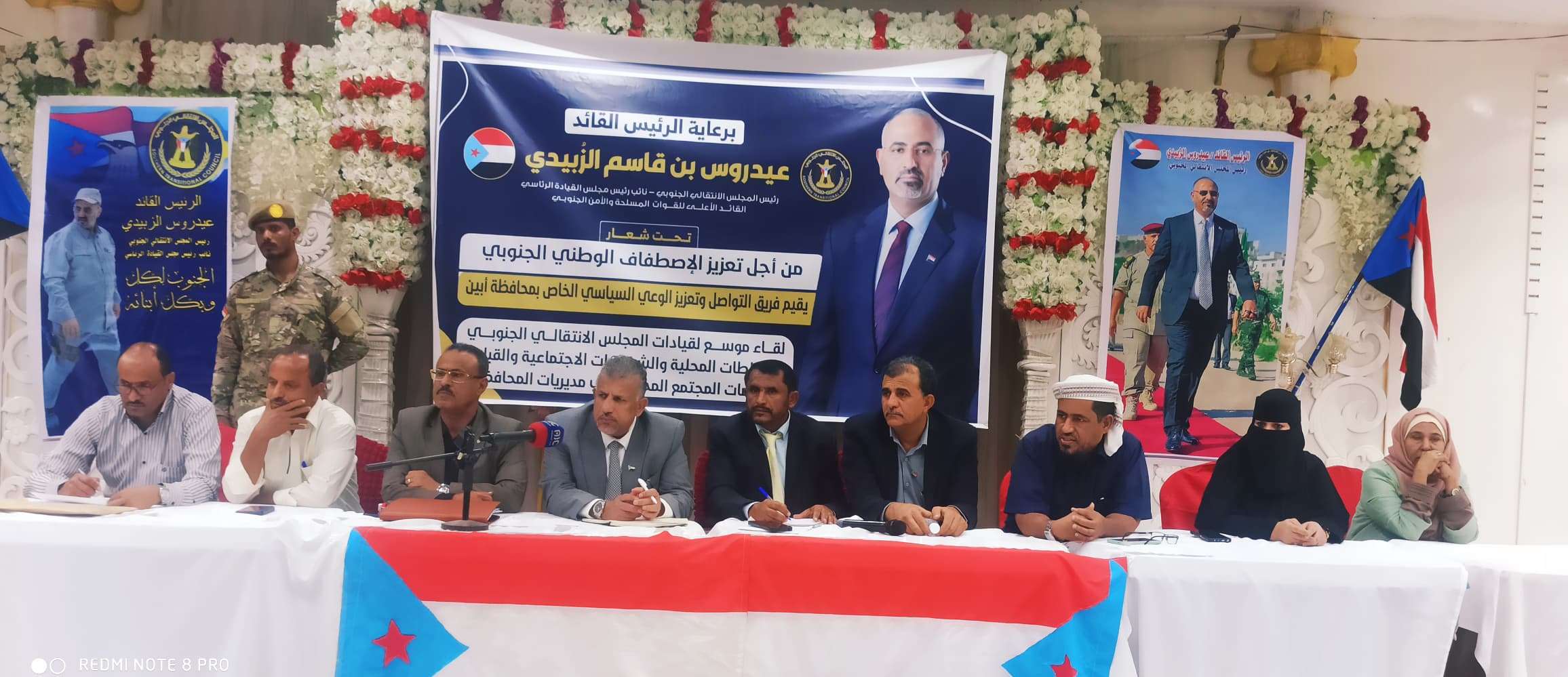 فريق التواصل وتعزيز الوعي السياسي بالمجلس الانتقالي يعقد لقاءً موسعًا مع قيادات المجلس وشخصيات اجتماعية في خنفر عقد فريق التواصل وتعزيز الوعي السياسي بالمجلس الانتقالي الجنوبي، برئاسة عضو هيئة رئاسة الاستاذ عبدال...