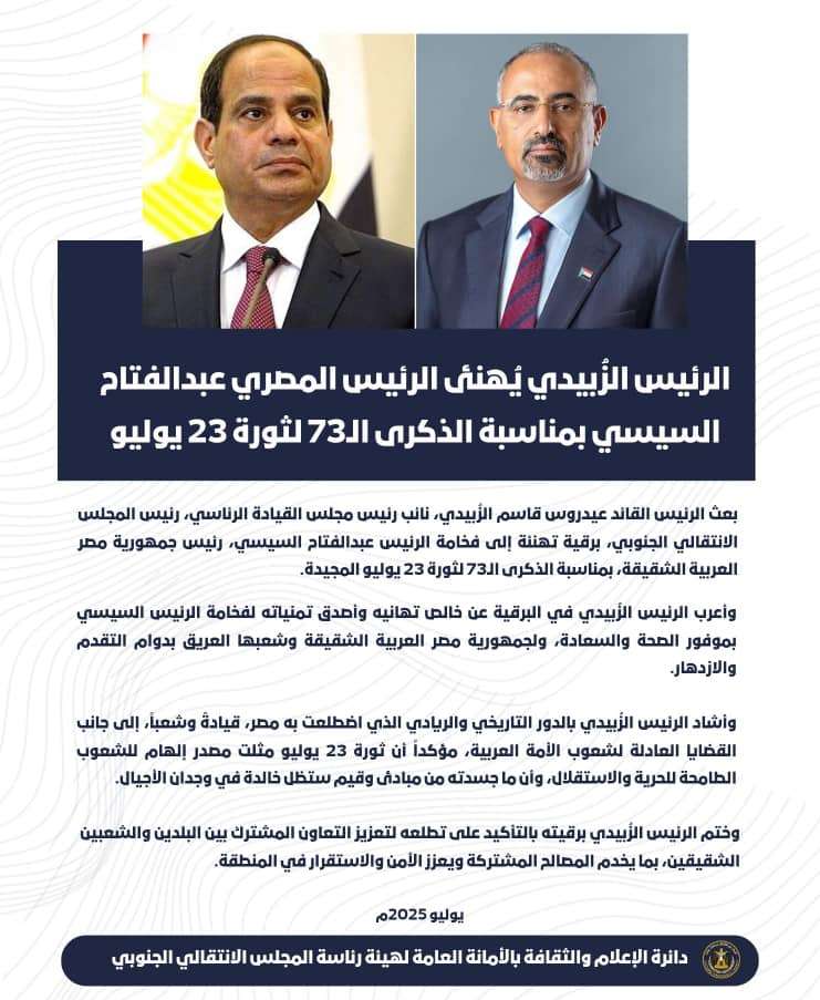 الرئيس الزُبيدي يُهنئ الرئيس المصري عبدالفتاح السيسي بمناسبة الذكرى الـ73 لثورة 23 يوليو