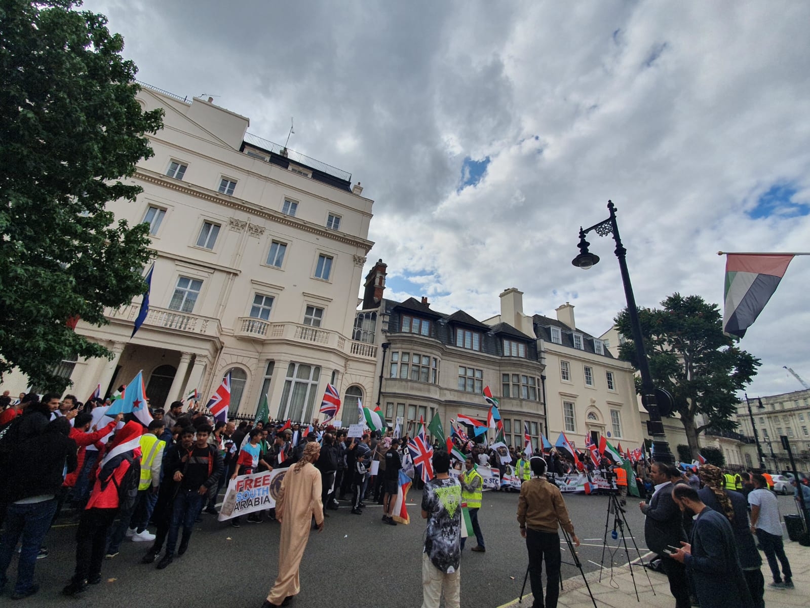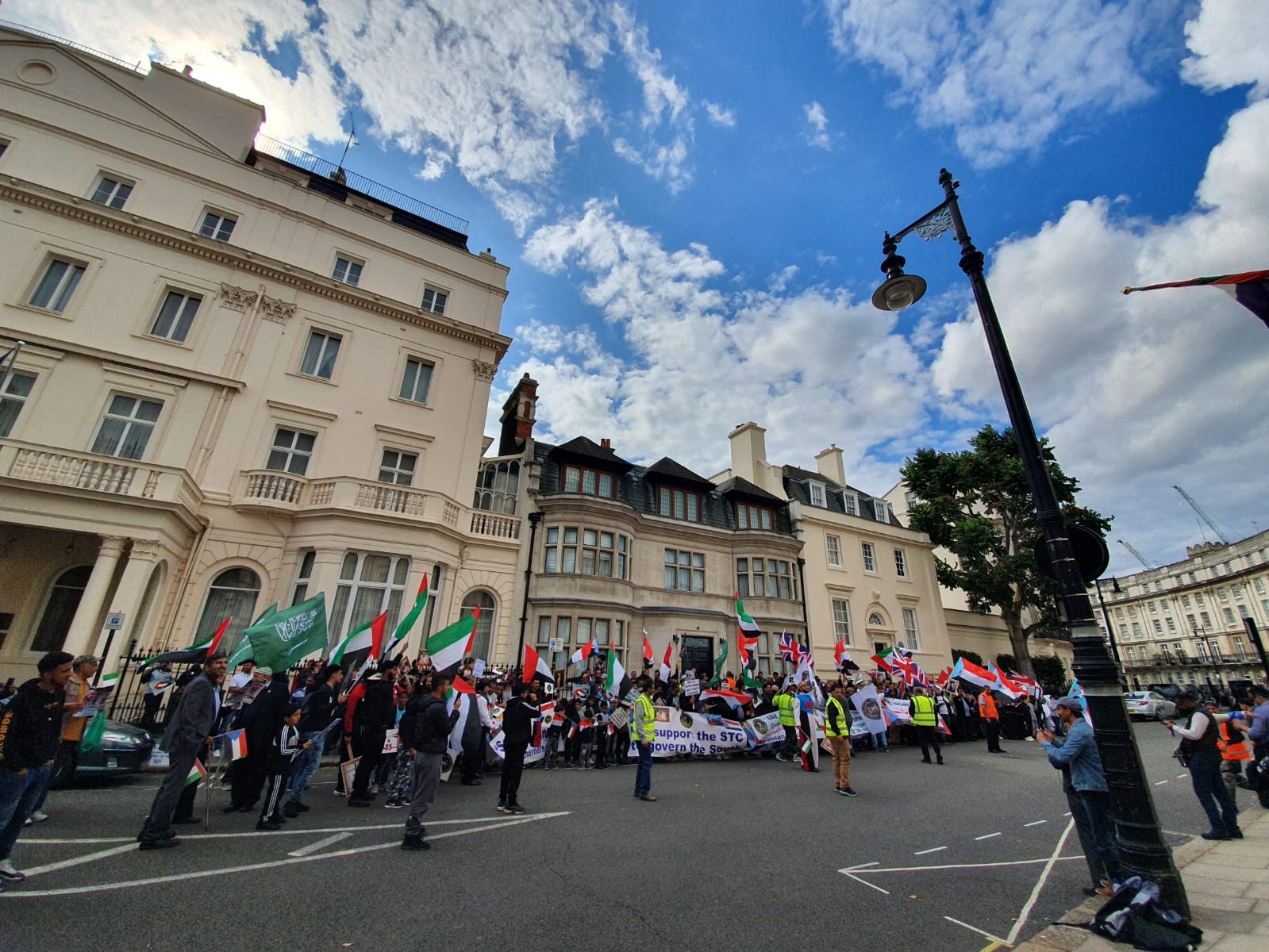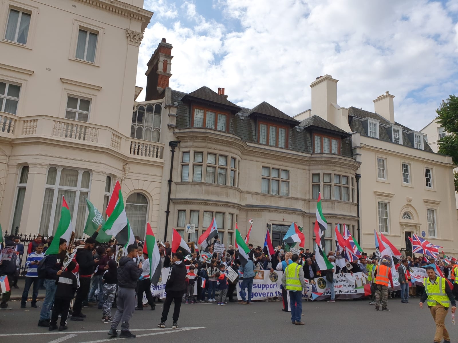 احتشد المئات من أبناء الجالية الجنوبية، رجالاً ونساءً وأطفال، ومن مختلف المدن والمقاطعات البريطانية، في تظاهرة حاشدة أمام مبنى السفارة الإماراتية في العاصمة البريطانية لندن ظهر يوم السبت ٧ سبتمبر ٢٠١٩م.