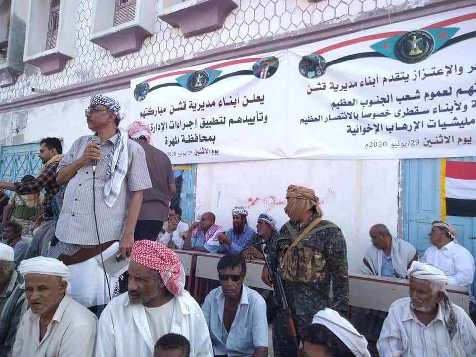 في الفعالية الجماهيرية، التي شهدت أيضاً حضوراً مميزاً للقطاع النسوي بالمديرية، أعلن أبناء مديرية قشن تأييدهم ومباركتهم للانتصارات التي حققتها القوات المسلحة الجنوبية في جزيرة سقطرى وتحريرها من الجماعات الإرهابية التابعة لجماعة الإخوان المدعومة من قطر وتركيا.