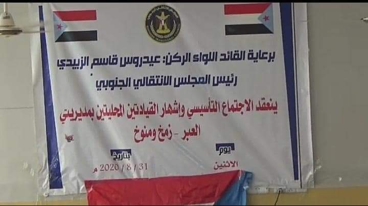 برعاية الرئيس القائد عيدروس قاسم الزُبيدي، رئيس المجلس الانتقالي الجنوبي، تم صباح اليوم الإثنين، إشهار قيادتين محليتين للمجلس، بمديريتي العبر، وزمخ ومنوخ، الصحراويتين بمحافظة حضرموت.
