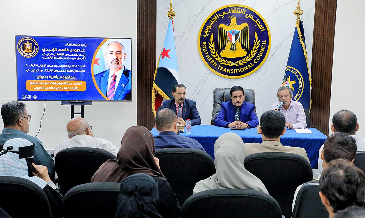 نظمت الدائرة السياسية بالأمانة العامة لهيئة رئاسة المجلس الانتقالي الجنوبي، اليوم الأربعاء في العاصمة عدن، محاضرة سياسية بعنوان "تصاعد حدة المواجهات في المنطقة وأثرها على قضية شعب الجنوب".