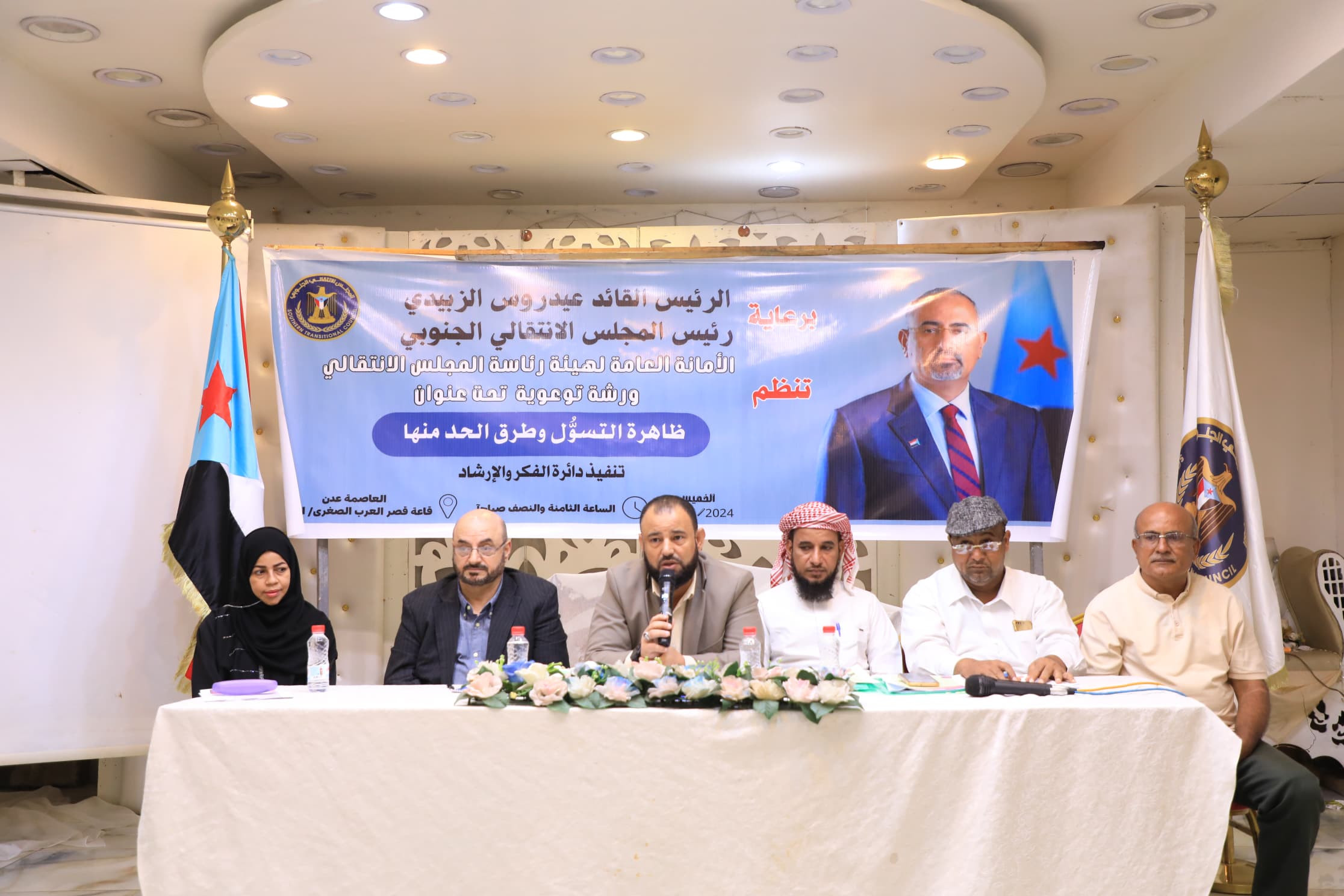 نظمت دائرة الفكر والإرشاد في الأمانة العامة لهيئة رئاسة المجلس الانتقالي الجنوبي، اليوم الخميس, بالعاصمة عدن، ورشة توعوية عن ظاهرة التسول وطرق الحد منها، بحضور عدد من المهتمين والخبراء الاجتماعيين.