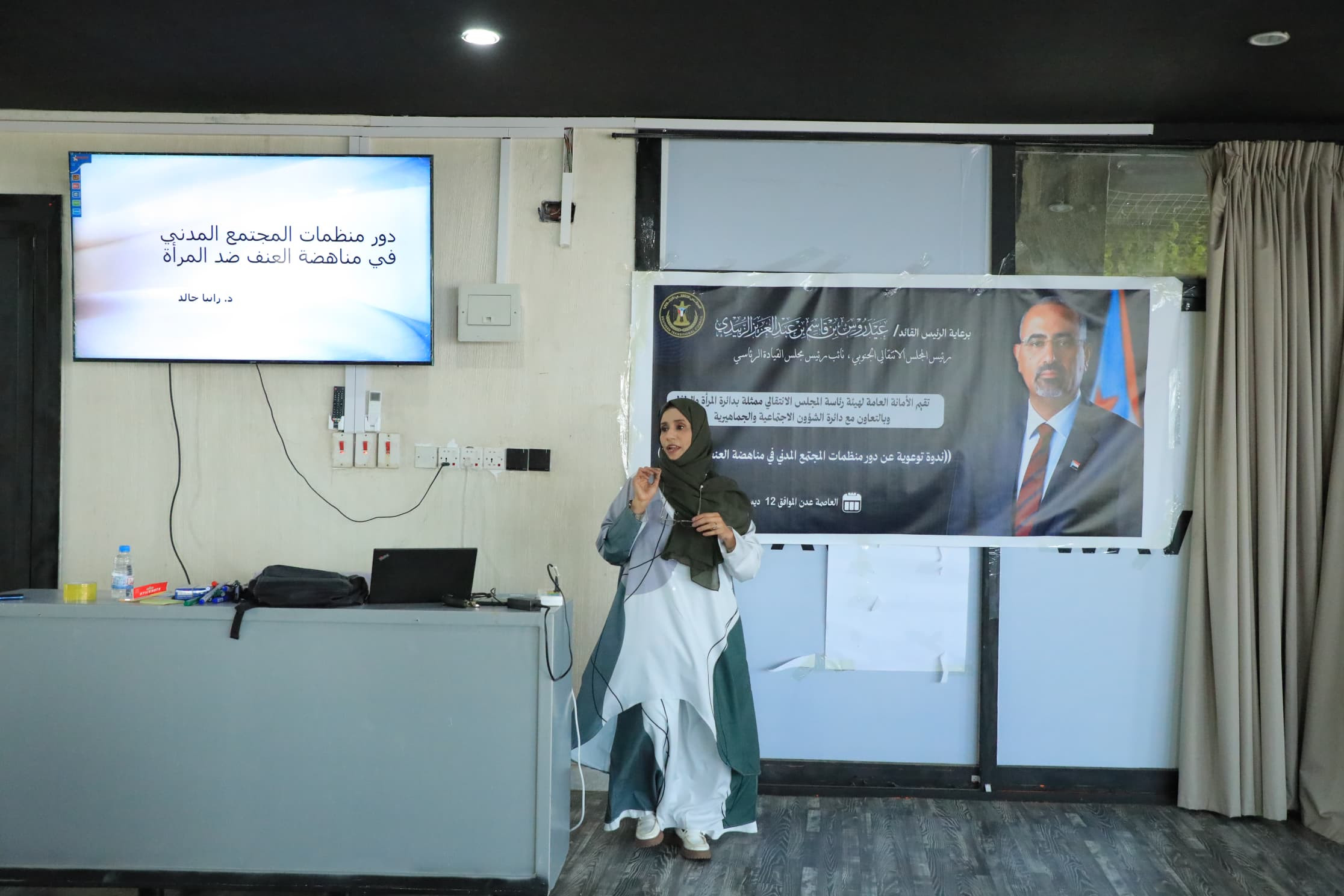 نظمت دائرة المرأة والطفل في الأمانة العامة لهيئة رئاسة المجلس الانتقالي الجنوبي، بالتعاون مع دائرة الشؤون الاجتماعية والجماهيرية، اليوم الخميس، ندوة توعوية في العاصمة عدن حول دور منظمات المجتمع المدني في مناهضة العنف ضد المرأة، برعاية الرئيس القائد عيدروس قاسم الزبيدي، رئيس المجلس الانتقالي الجنوبي.