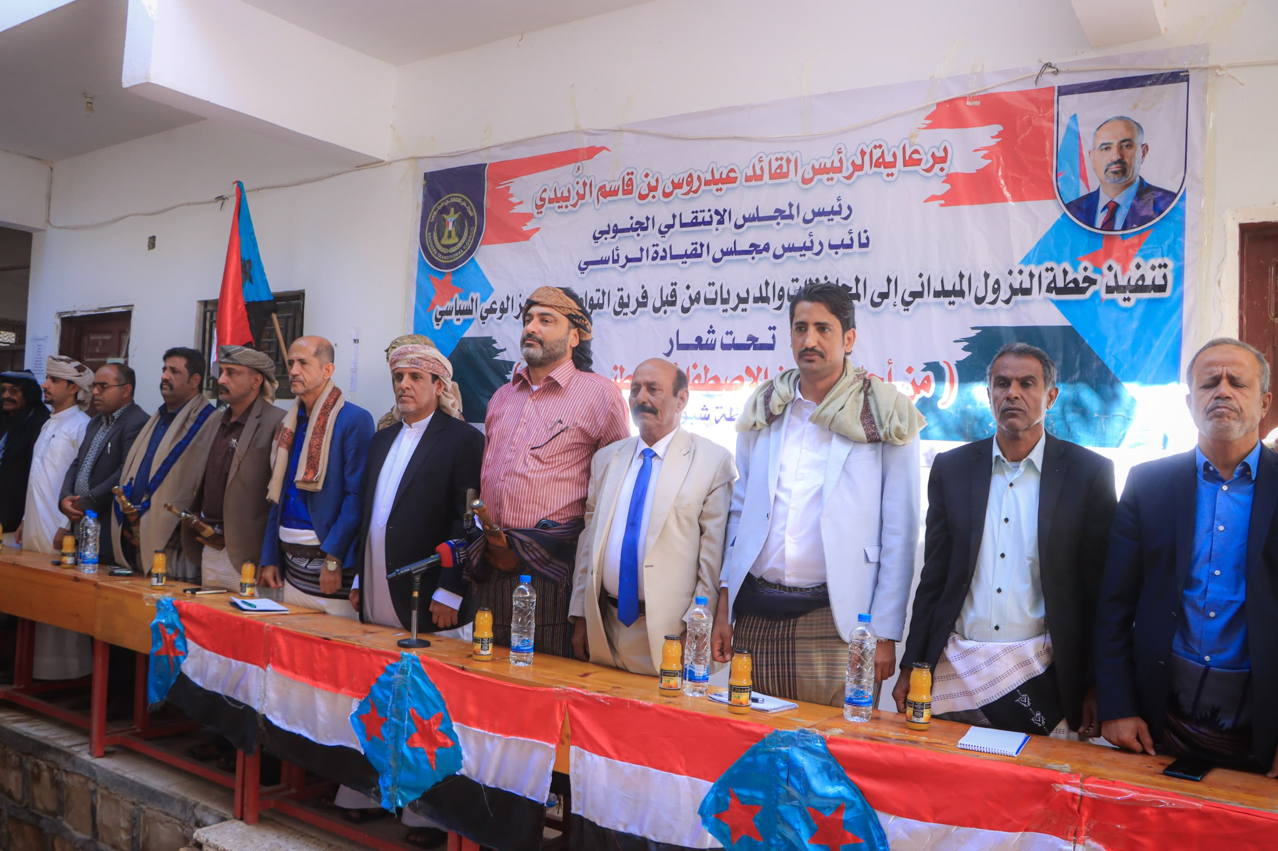 وفي مستهل اللقاء، الذي بدأ بآيات من القرآن الكريم ثم النشيد الوطني عقبه الوقوف دقيقة حداد على أرواح الشهداء، أوضح الجفري أن فرق التواصل تنفذ النزولات الميدانية إلى كافة مديريات شبوة، والجنوب كافة بتكليف من الرئيس القائد عيدروس الزبيدي، بهدف الاطلاع على احتياجات أبناء الجنوب، وإيضاح مستجدات الوضع السياسي، خصوصًا في هذه المرحلة المفصلية من قضية شعب الجنوب.