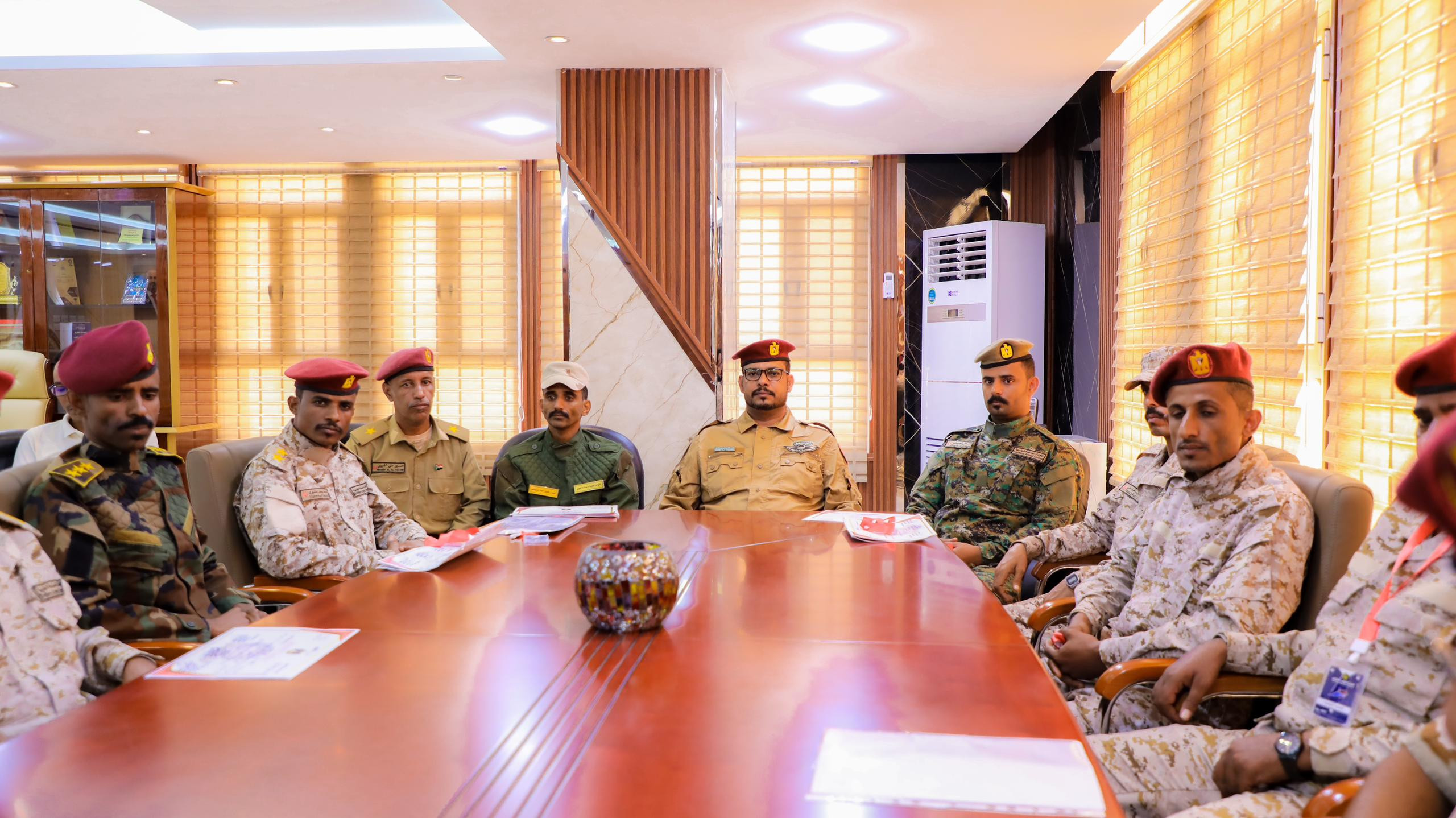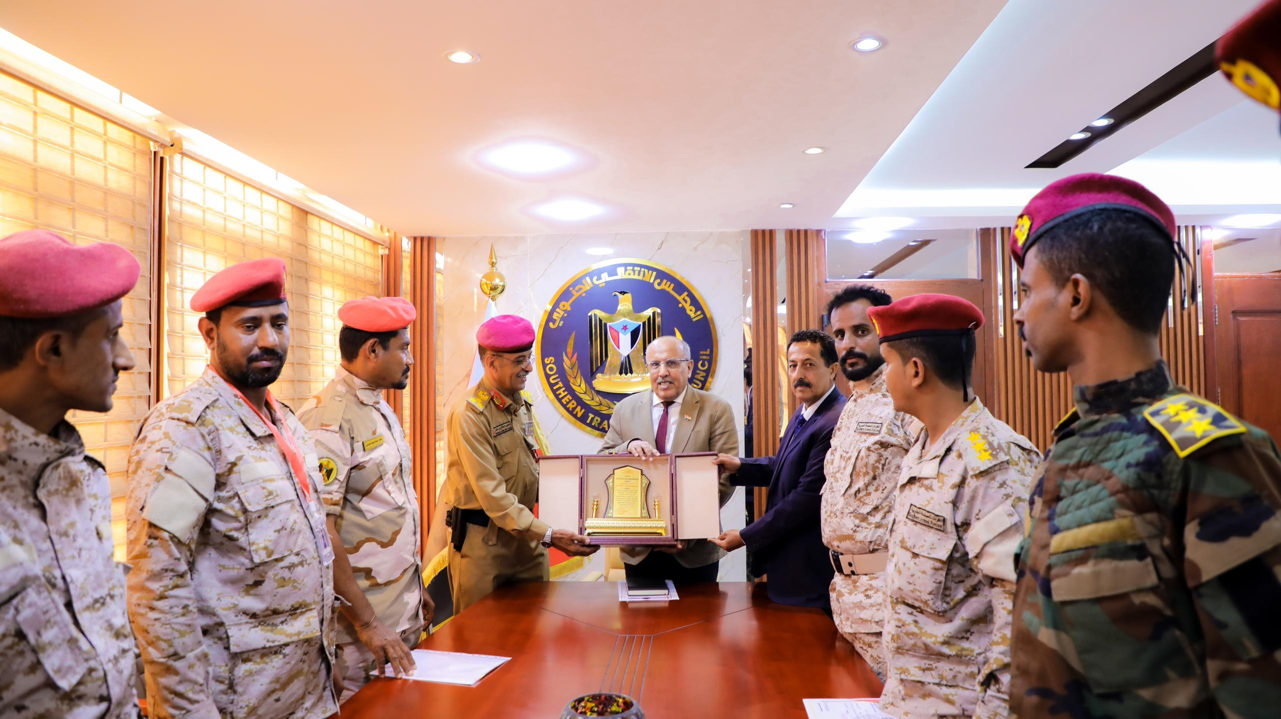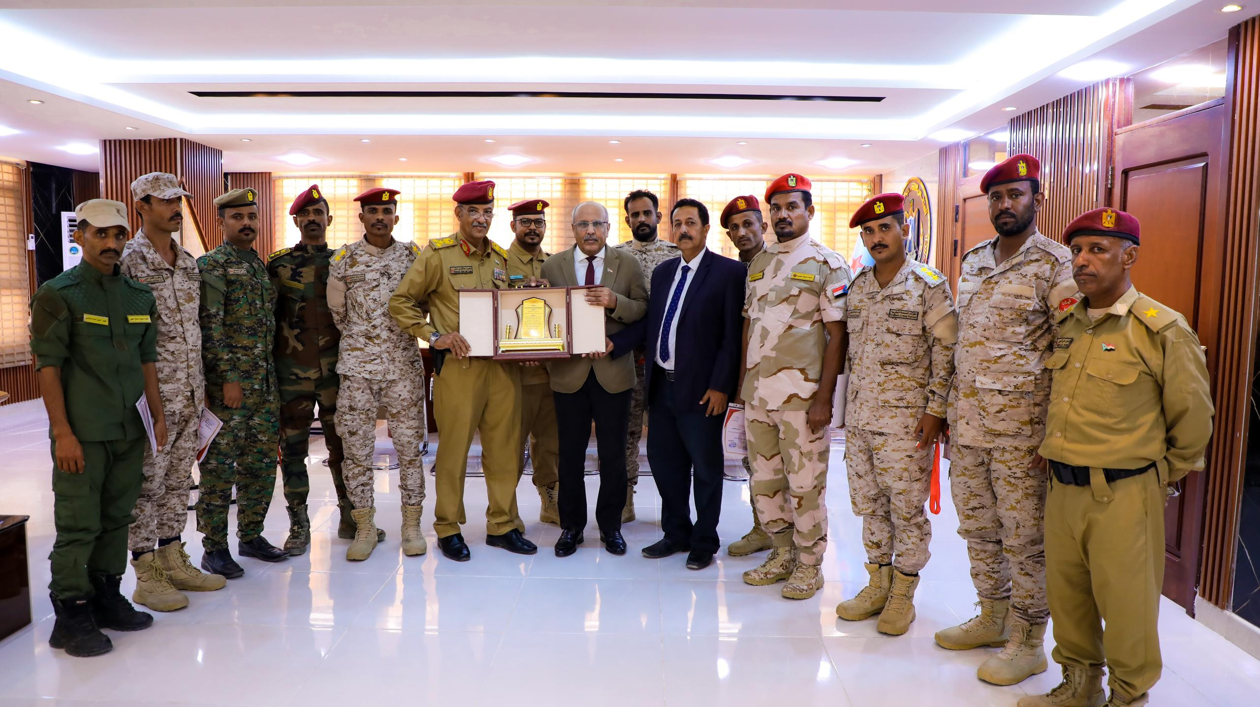 وفي ختام اللقاء، أهدى الضباط الخريجون درع الشكر والعرفان للأستاذ علي الكثيري، تقديراً لجهوده المبذولة واهتمامه بتأهيل الكوادر العسكرية، وتسهيل العملية التعليمية في الجانب العسكري، ودعمه فرص التأهيل والتدريب العسكري والأمني، وتذليل الصعاب أمامهم على طريق بناء الجيش الجنوبي والمؤسسة الأمنية لدولة الجنوب الفيدرالية المستقلة المنشودة.