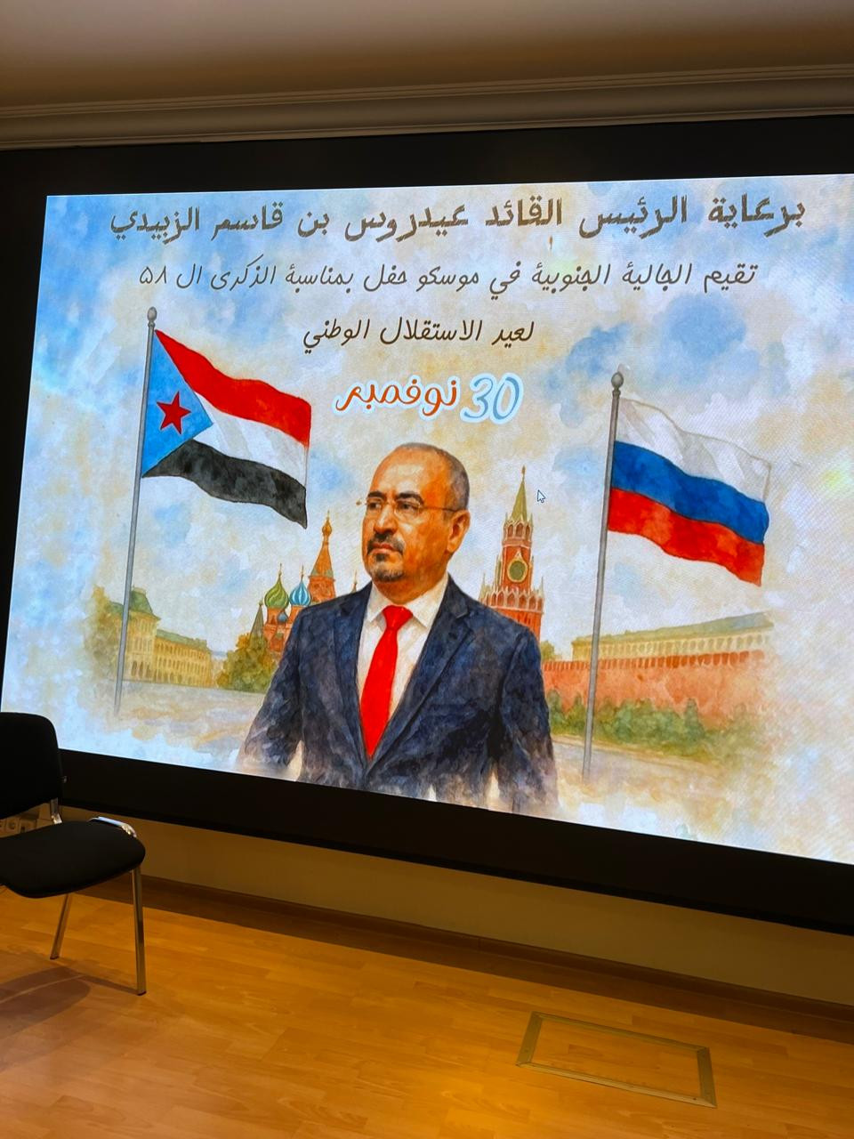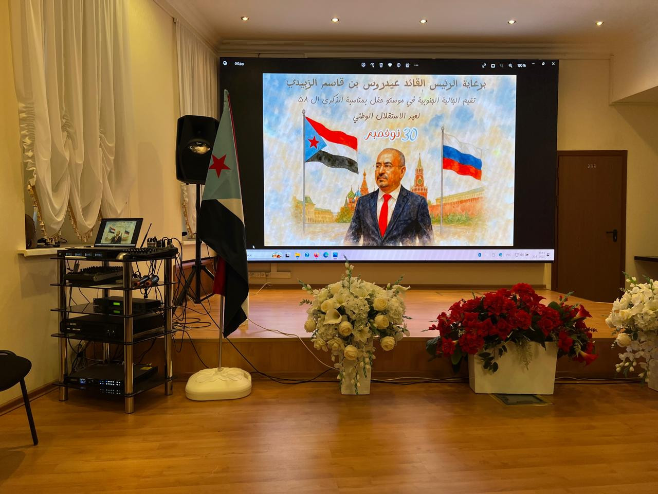 نظّمت الجالية الجنوبية في روسيا الاتحادية احتفالًا بمناسبة الذكرى الـ58 لعيد الاستقلال الوطني المجيد في الثلاثين من نوفمبر، برعاية الرئيس القائد عيدروس قاسم الزُبيدي، رئيس المجلس الانتقالي الجنوبي.