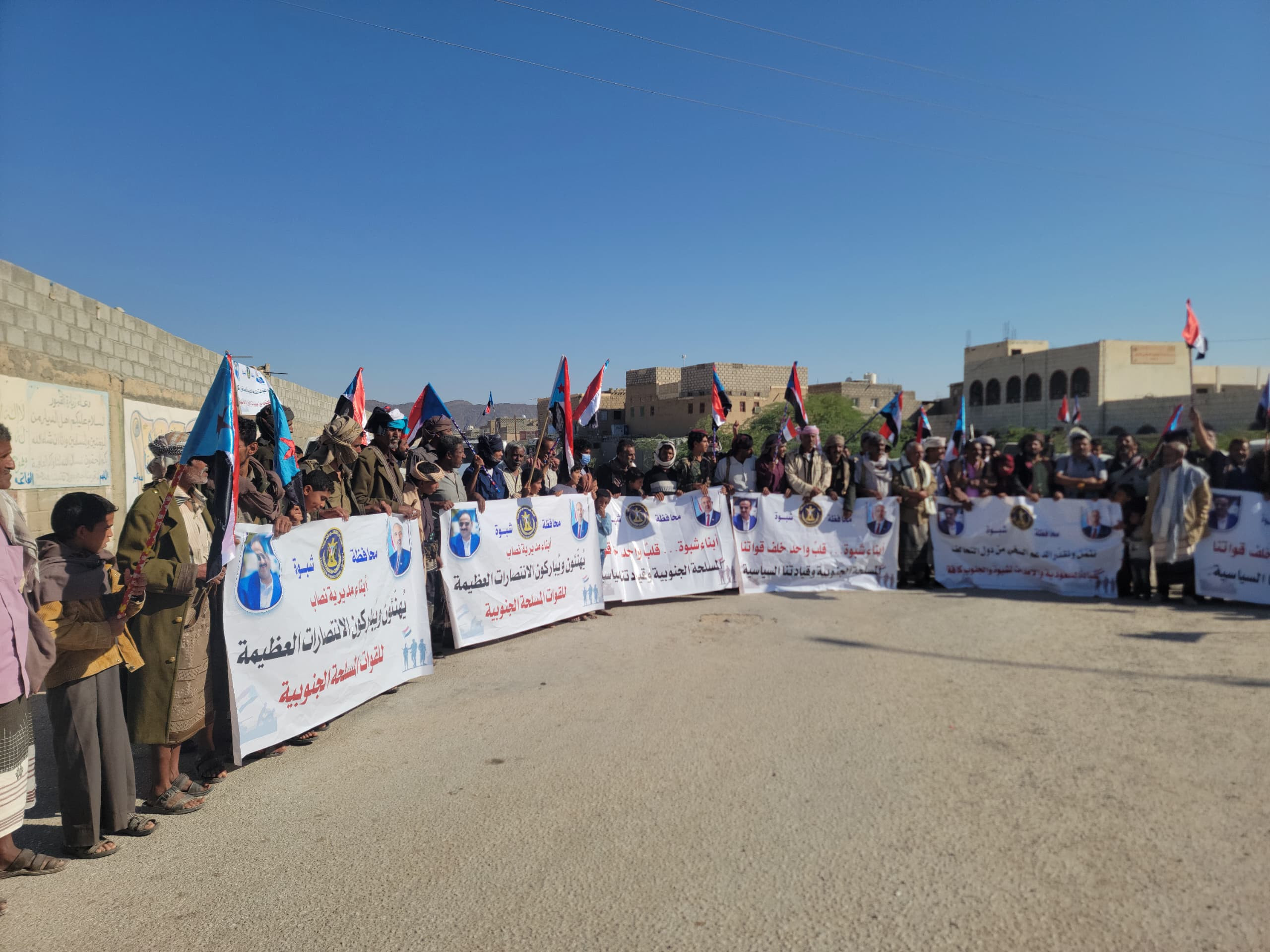 نظمت القيادة المحلية للمجلس الانتقالي الجنوبي في مديرية نصاب بمحافظة شبوة، اليوم السبت ، مسيرة جماهيرية احتفالاً بالانتصارات التي حققتها القوات المسلحة الجنوبية في عارين بشبوة، ومديريات وادي وصحراء حضرموت.