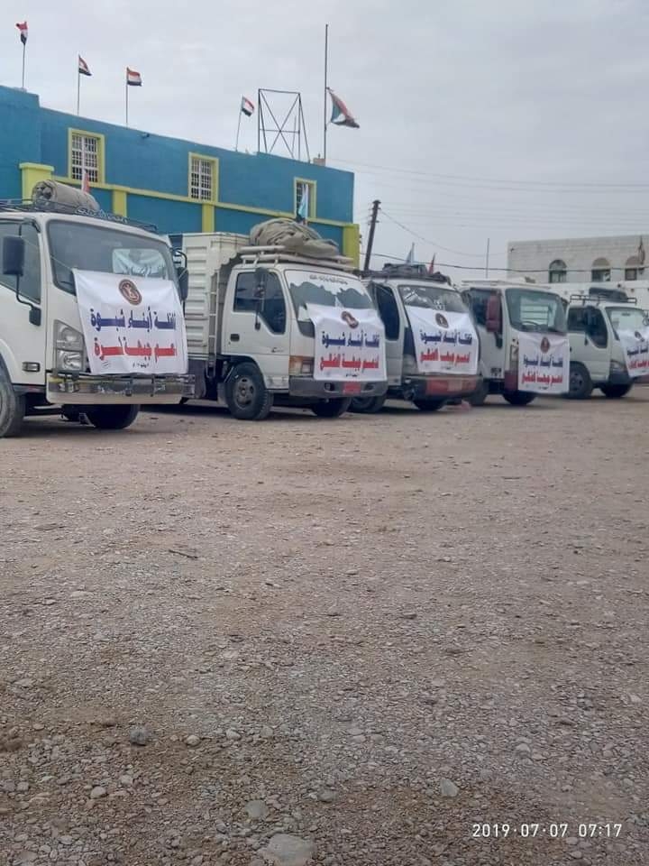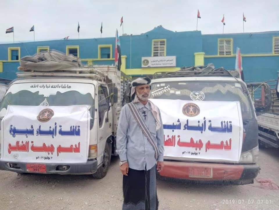 وفي تصريح صحفي أدلى به رئيس القيادة المحلية للمجلس الانتقالي بالمحافظة، الشيخ علي محسن السليماني، أعلن فيه انطلاق قافلة المعونات التي تحتوي على كمية من المواد الغذائية و المياه المعلبة والأدوية والمستلزمات الأخرى.