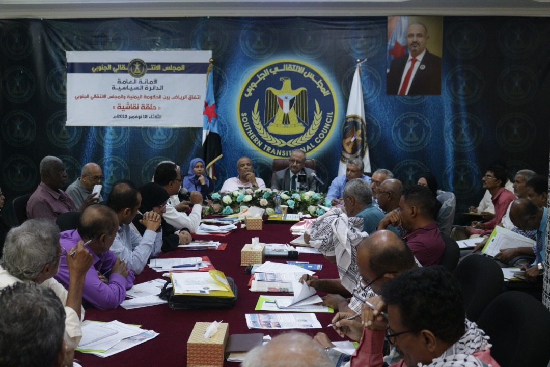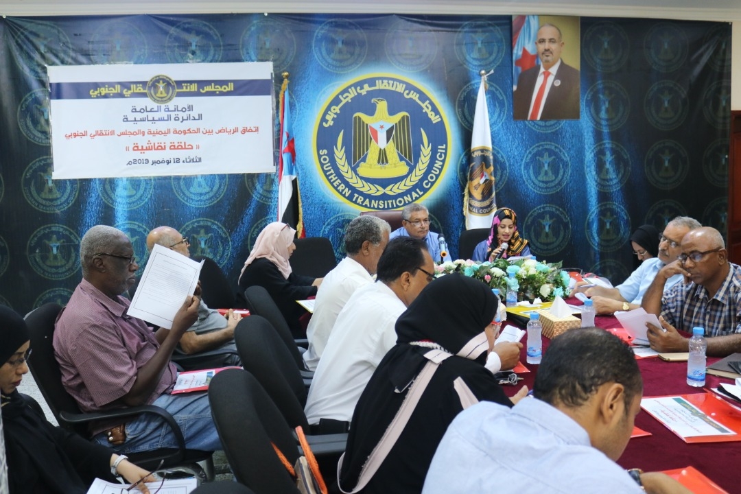 نظمت الدائرة السياسية في الأمانة العامة لهيئة رئاسة المجلس الانتقالي الجنوبي، اليوم الثلاثاء بالعاصمة عدن، حلقة نقاشية تحت عنوان " اتفاق الرياض بين المجلس الانتقالي الجنوبي والحكومة اليمنية"، شارك فيها عدد من رؤساء القيادات المحلية.