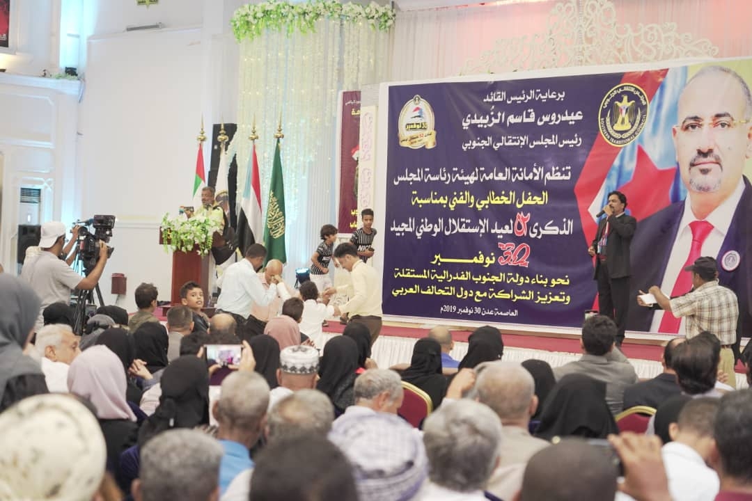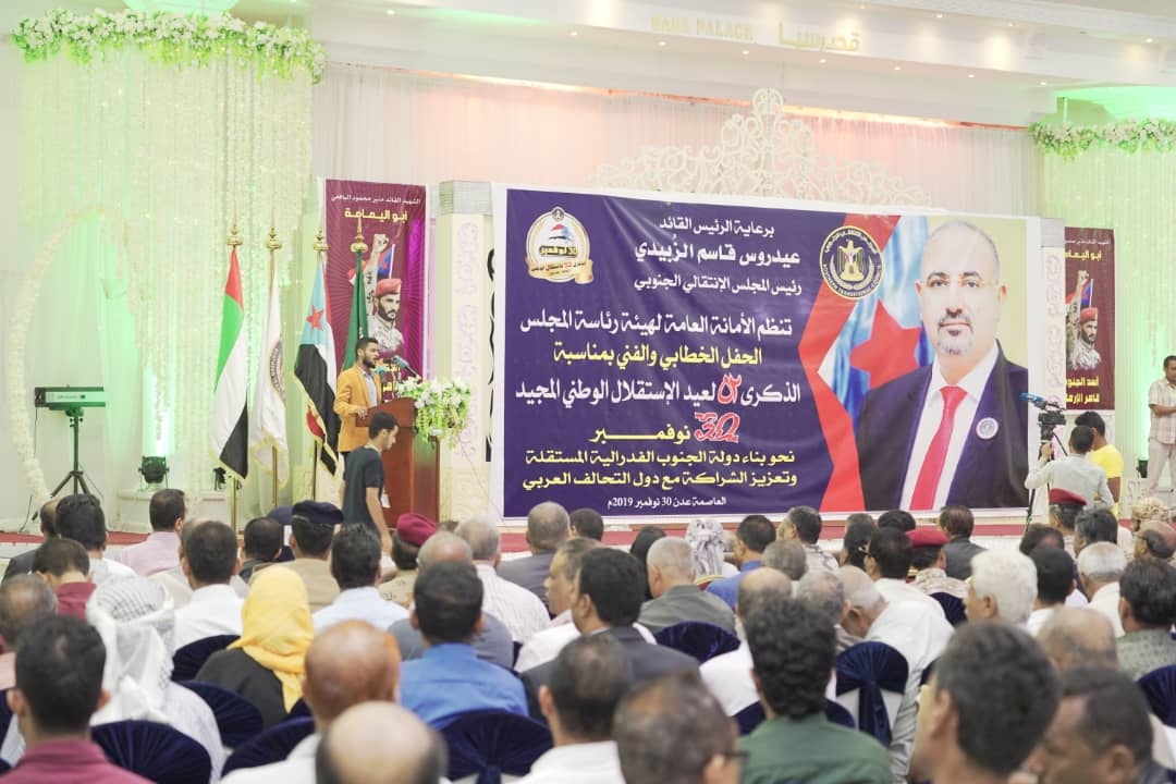 نظمت الأمانة العامة لهيئة رئاسة المجلس الانتقالي الجنوبي، اليوم السبت في العاصمة عدن، حفلاً خطابياً وفنياً بمناسبة الذكرى 52 لعيد الاستقلال الوطني 30 نوفمبر، تحت شعار "معا نحو بناء دولة الجنوب الفيدرالية المستقلة وتعزيز الشراكة مع دول التحالف العربي"، بحضور الأستاذ فضل الجعدي، مساعد الأمين لهيئة رئاسة المجلس، والأستاذ لطفي شطارة، والعميد ناصر السعدي، والمحامية نيران سوقي، و الدكتورة منى باشراحيل، والدكتورة سهير علي أحمد، أعضاء هيئة رئاسة المجلس الانتقالي الجنوبي.