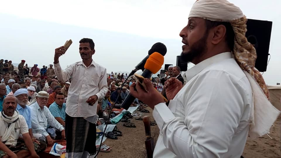 واستمع الجعدي والوالي، بمعية المشاركين في الاعتصام الذي تقدمهم العميد صالح زنقل، رئيس الهيئة العليا للجيش والأمن الجنوبي ونائبه العميد ركن صالح محسن القاضي، وأعضاء الهيئة، إلى خطبتي عيد الأضحى من خطيب الساحة، قبل أن يتبادلا مع الجموع الحاضرة التهاني والتبريكات بالعيد السعيد، سائلين المولى العلي القدير ان يمن على شعبنا الجنوبي والامتين العربية والاسلامية بالخير واليُمن والبركات .