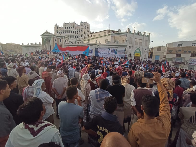 ورددت الجماهير شعارات مطالبة قيادة التحالف العربي بتنفيذ اتفاق الرياض كاملاً غير مجزأ او منقوص ، والذي يؤكد في شقه الأمني على سحب قوات المنطقة العسكرية الأولى من وادي حضرموت .